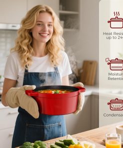 YASHE Cocotte en fonte émaillée 5L avec couvercle, Faitout rond antiadhésif pour soupes, ragoûts, pain et cuisson au four, Rouge