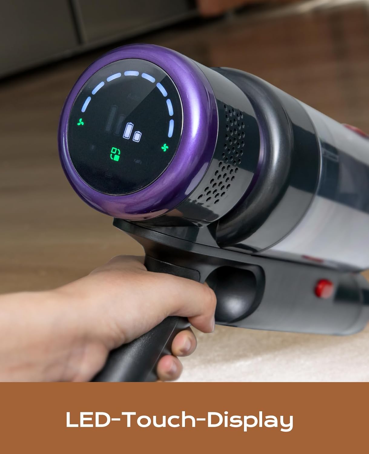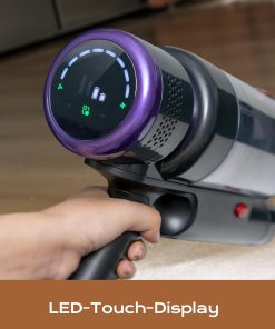 - Écran tactile LED : le panneau de commande LED intelligent permet une adaptation facile de la puissance d’aspiration et affiche l’état de la batterie, ainsi que des signalisations de brosses bouchées et des blocs d’aspiration. Ce design est plus pratique et pratique que les commandes à bouton traditionnels
