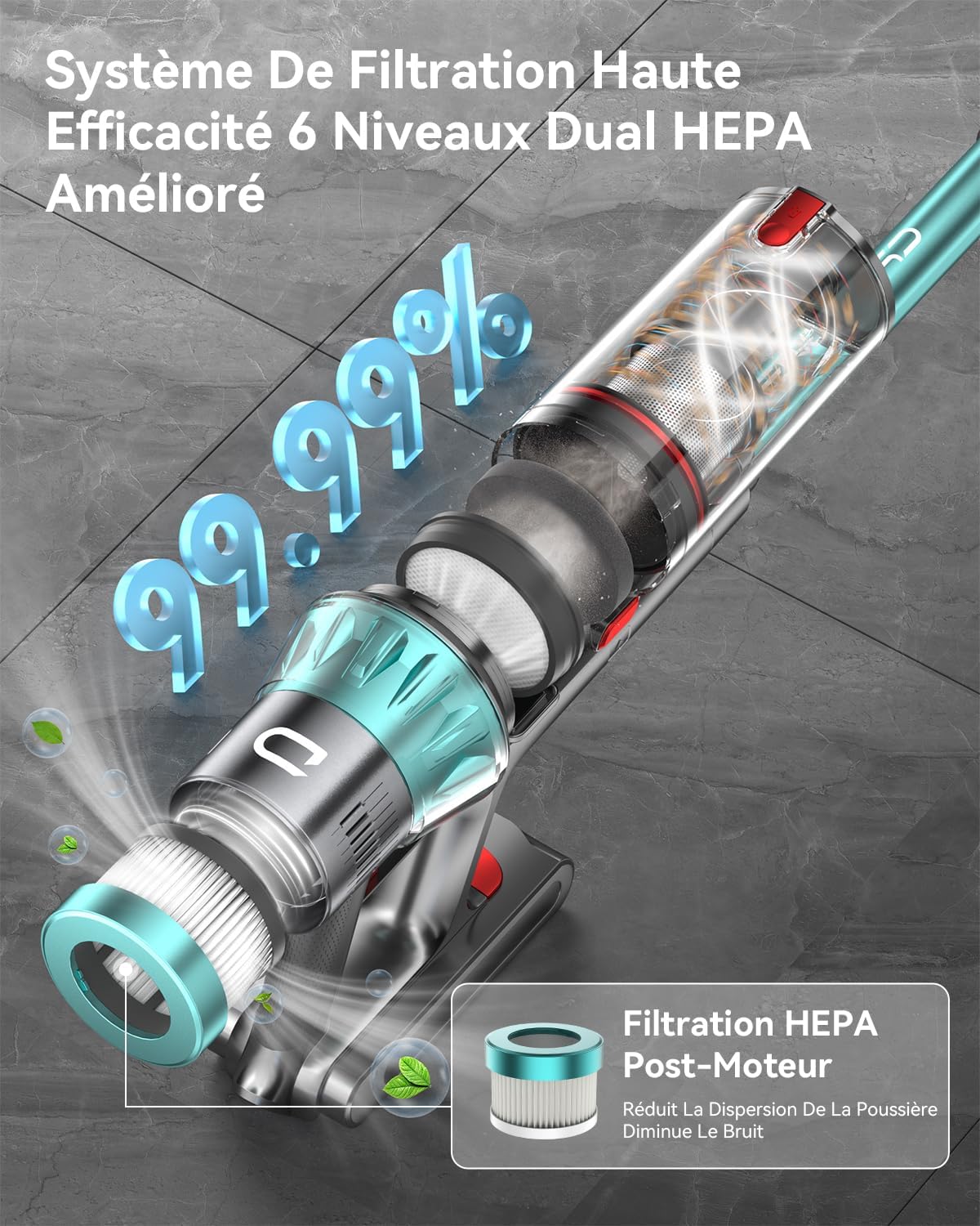 - Double Système de Filtration HEPA Niveau 6: Équipé d’un filtre HEPA avant et d’un système de filtration HEPA après le moteur, il capture efficacement 99,99 % des particules de poussière. La filtration HEPA post-moteur contrôle mieux le flux d’air, limite la dispersion des poussières et réduit les nuisances sonores liées à l’évacuation.