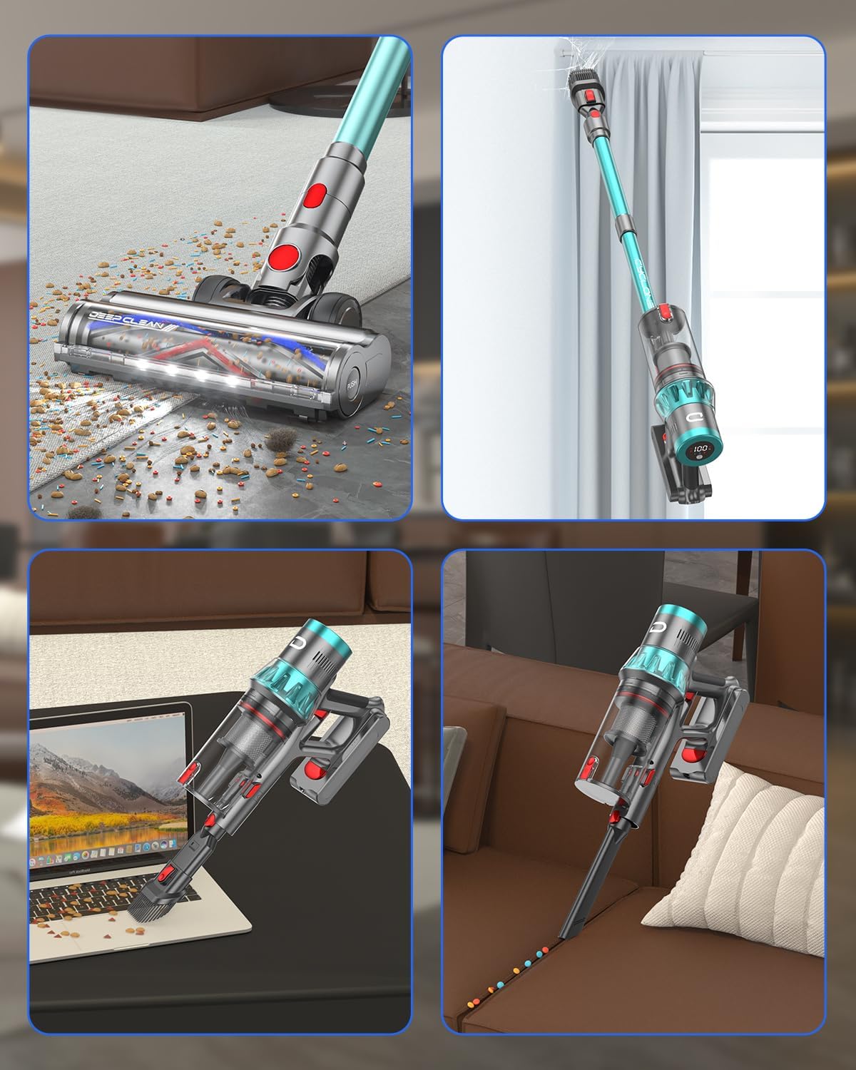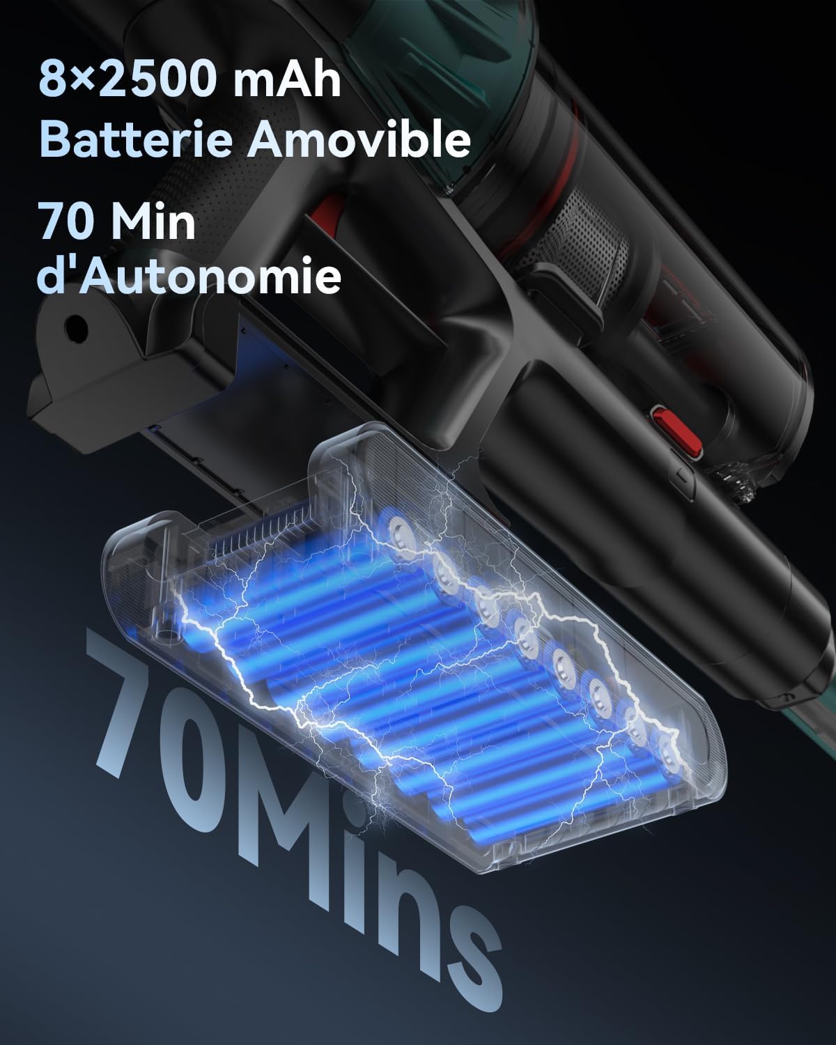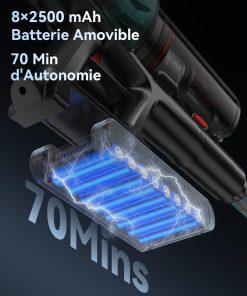 - Autonomie Ultra-longue de 70 Minutes: L’aspirateur sans fil puissant intègre une batterie haute capacité de 8*2500 mAh, offrant jusqu’à 70 minutes d’autonomie en mode ECO. Une seule recharge suffit pour nettoyer toute la maison, répondant aux besoins de différents types de logements.