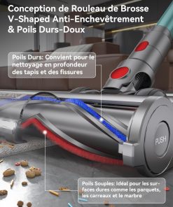 - Brosse en V Anti-enchevêtrement: La brosse innovante en forme de V empêche efficacement l’enchevêtrement des cheveux, aspirant facilement les cheveux longs et les poils d’animaux, et réduisant ainsi la fréquence de nettoyage de la brosse. Combinée à un éclairage LED haute intensité, elle éclaire aisément les zones sombres sous les lits et les canapés.