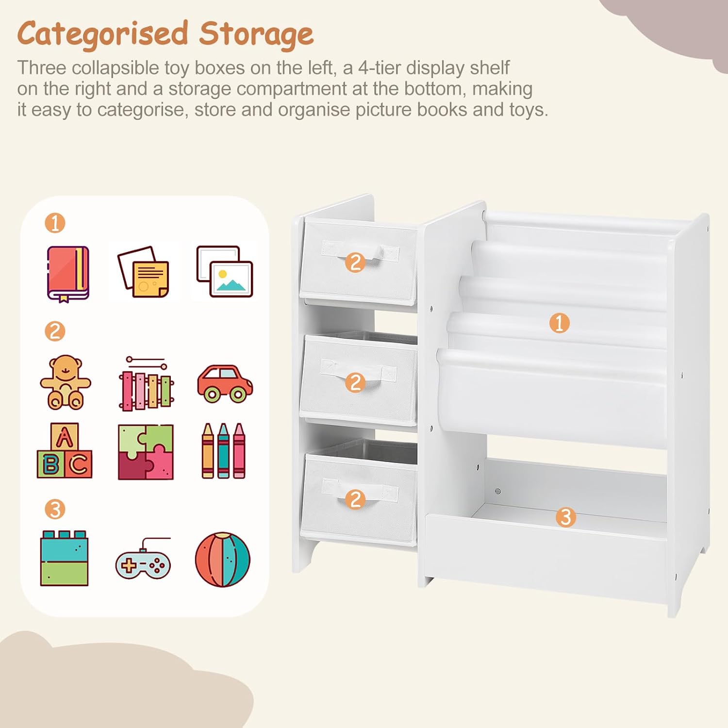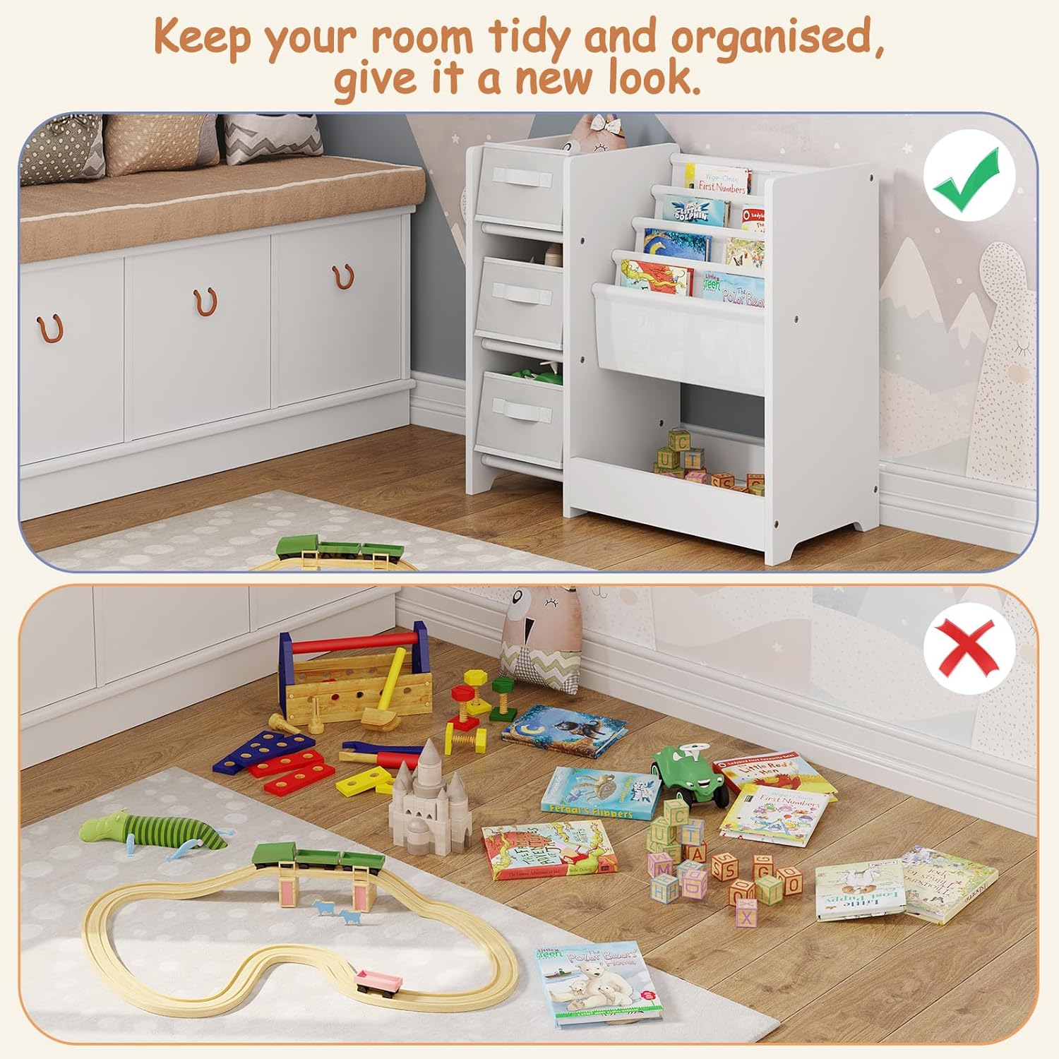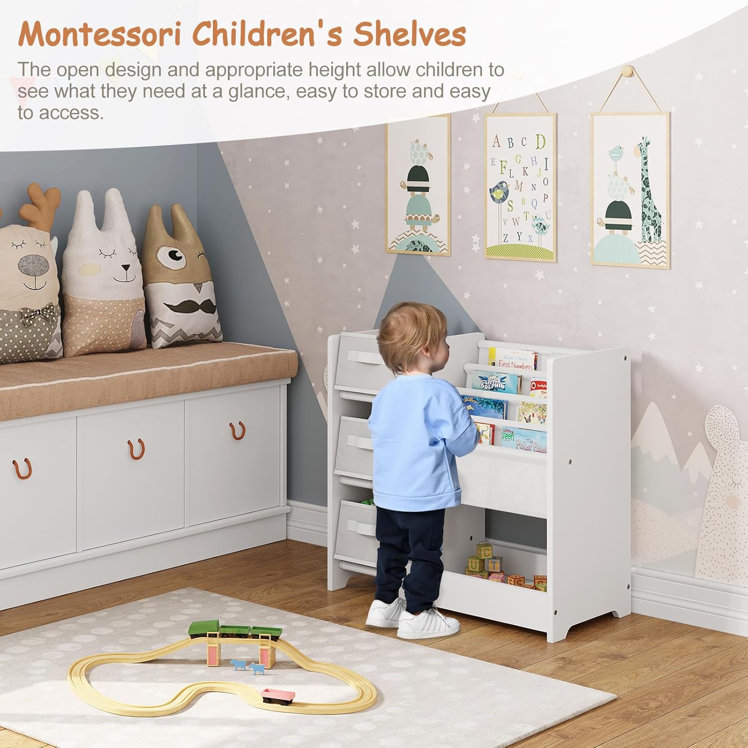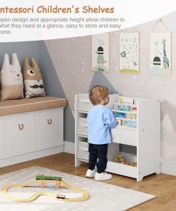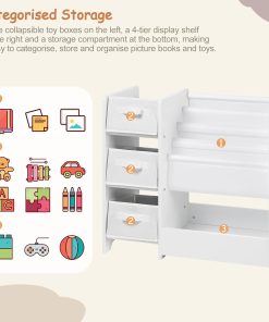 - Multiples espaces de rangement : L’étagère pour enfants est dotée de 3 boîtes de rangement pliables, de 4 compartiments à suspendre et d’une grande zone de rangement. Tous les jouets et livres de différents formats peuvent être rangés de manière claire