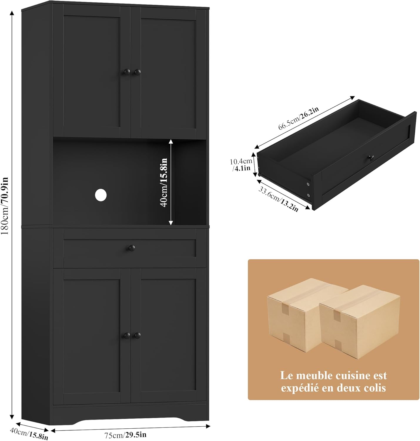 - Meuble Cuisine de 180 cm : Ce buffet cuisine mesure 75 x 40 x 180 cm et offre un grand espace de rangement vertical. Derrière les 4 portes, 4 étagères réglables offrent un espace généreux pour les courses, les épices, les ustensiles de cuisine et la nourriture. Le grand tiroir permet de ranger couverts, bouteilles et canettes. Le spacieux plan de travail ouvert crée un petit espace bar, idéal pour une cafetière, un micro-ondes ou un grille-pain
