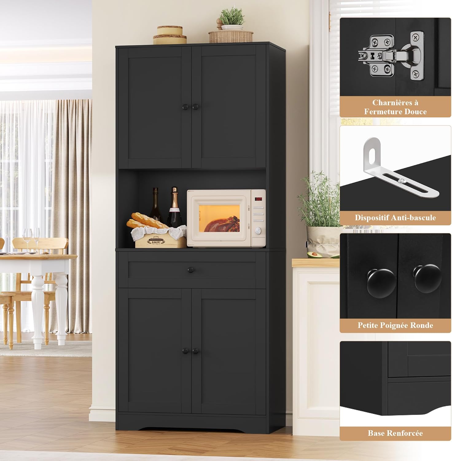 - Design Bien Pensé : Fatigué des bruits de cliquetis ? FOREHILL armoire de cuisine est équipée de charnières métalliques à fermeture douce, permettant aux portes de se fermer lentement et silencieusement grâce à un glissement en douceur. Un trou pré-percé est prévu à l’arrière du plan de travail pour faciliter le passage des câbles. Nous recommandons également l’installation d’un dispositif anti-basculement pour fixer le buffet au mur