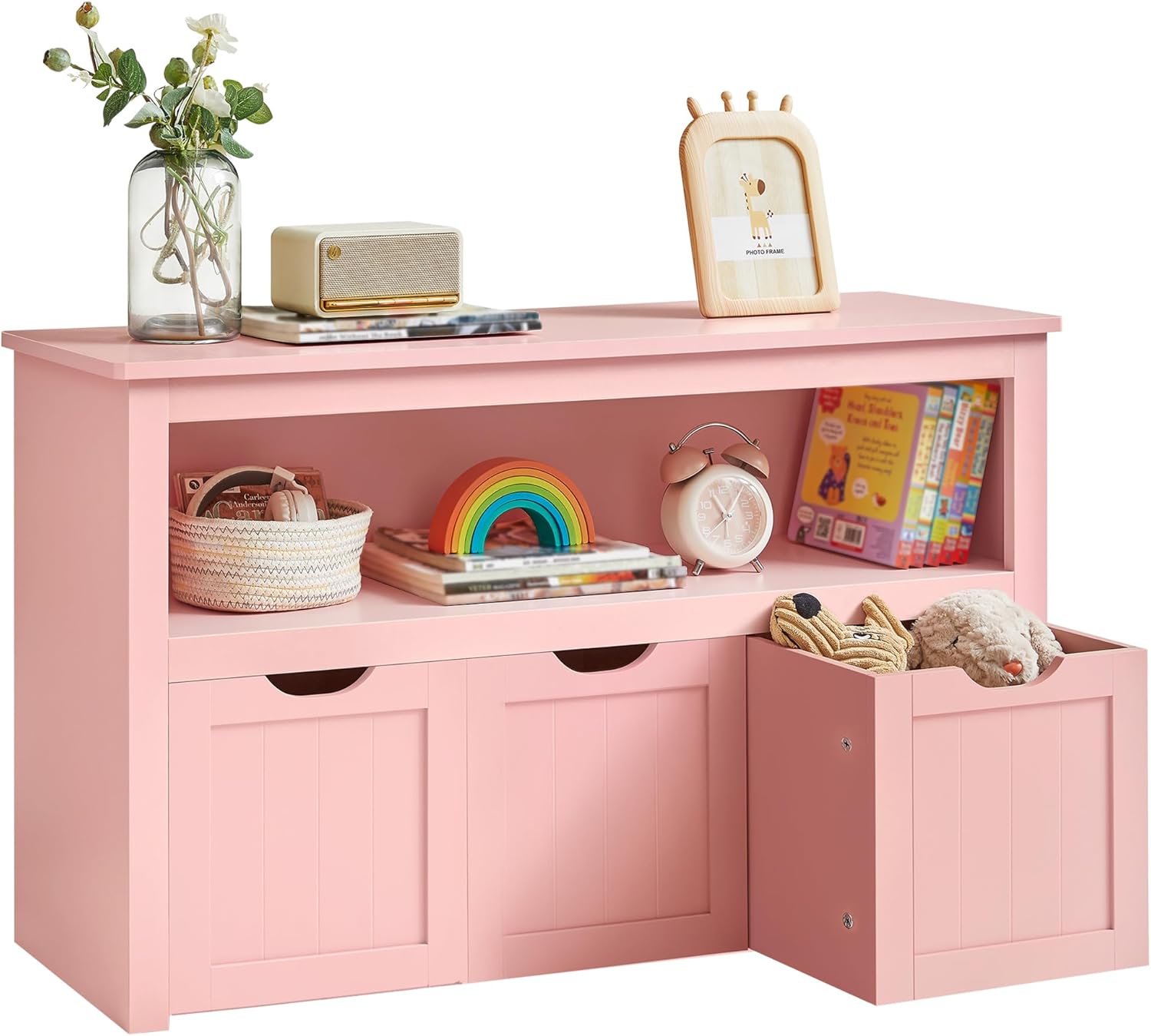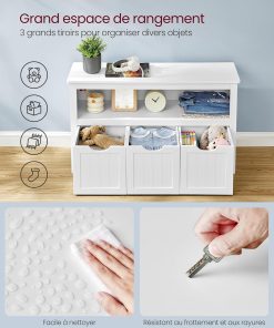 Très pratique et joli, ce meuble VASAGLE pour jouets est facile à monter et offre beaucoup de rangement grâce aux trois bacs à roulettes; le blanc s’intègre bien dans la chambre ou le salon, les roulettes roulent bien et la structure semble assez solide pour un usage quotidien — parfait pour organiser la salle de jeu sans prendre trop de place.