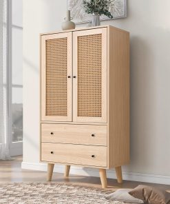 La commode en rotin offre un look naturel et sobre, avec deux portes et deux tiroirs bien pensés pour un rangement organisé; elle s’intègre discrètement dans un couloir, une chambre ou une salle à manger et donne une impression de qualité tout en restant polyvalente.