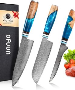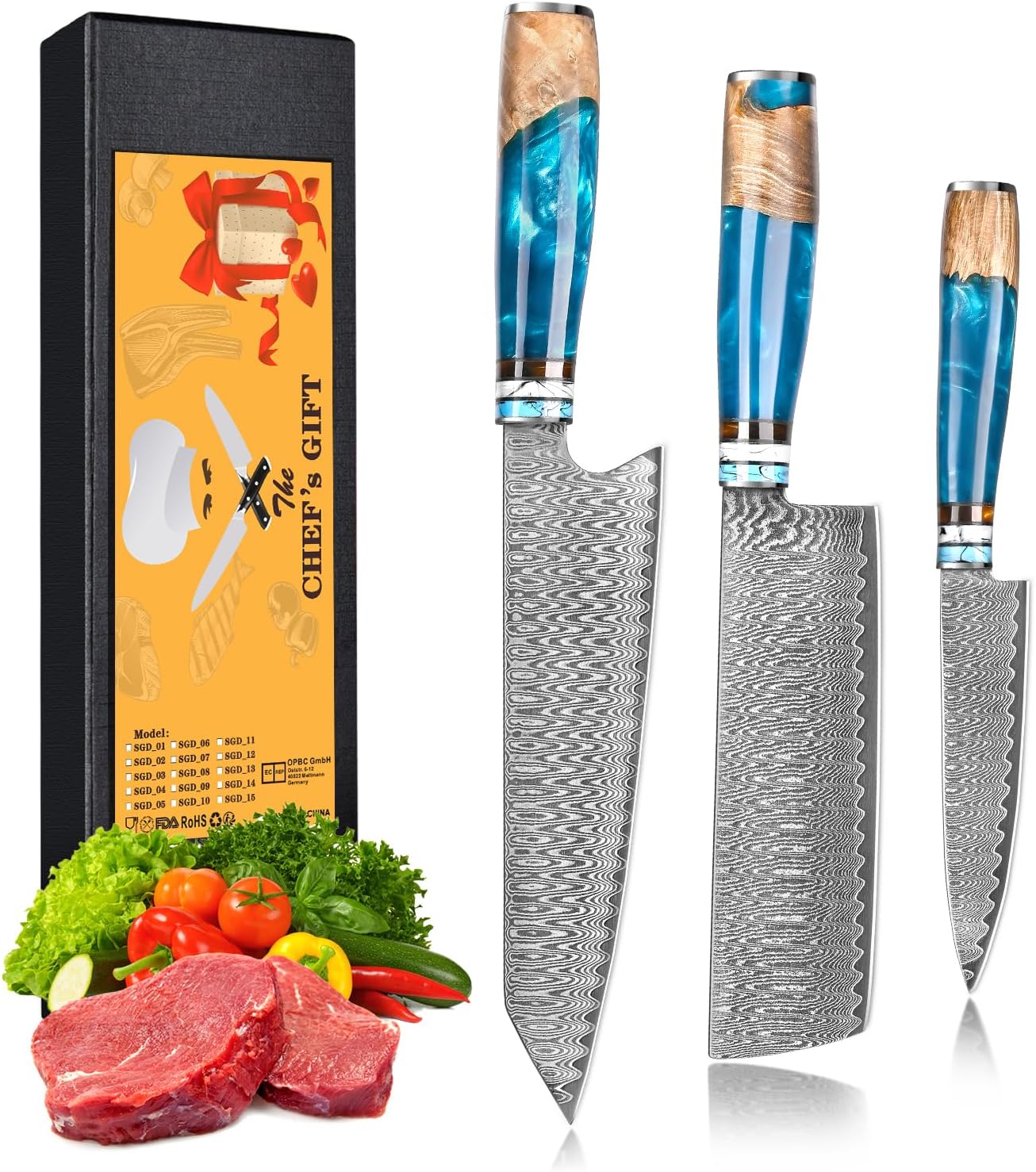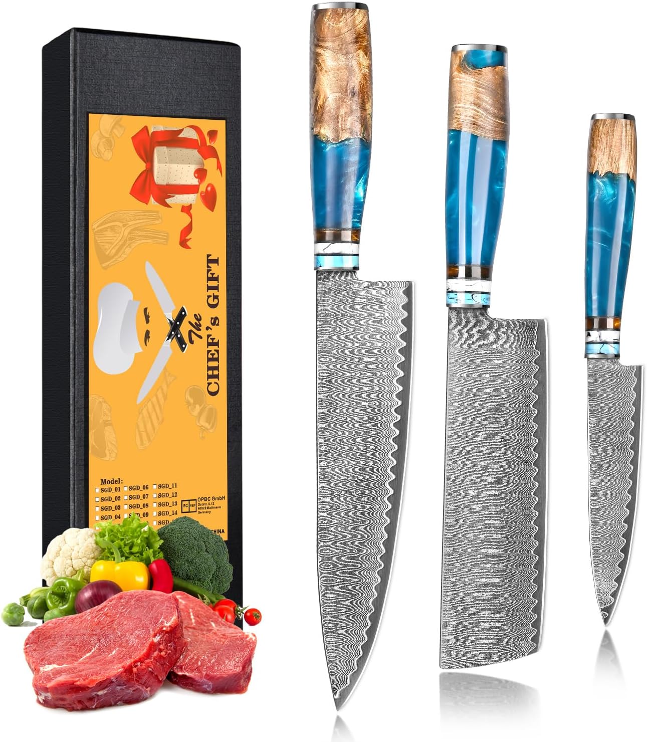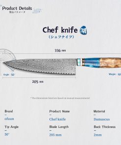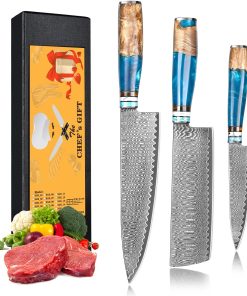 Couteau magnifique et très efficace : la lame en Damas de 20 cm est incroyablement tranchante et tient bien le fil, le manche en résine bleue est ergonomique et agréable en main, l’équilibre est parfait et la présentation en boîte cadeau en fait un excellent choix pour cuisiner au quotidien ou offrir.