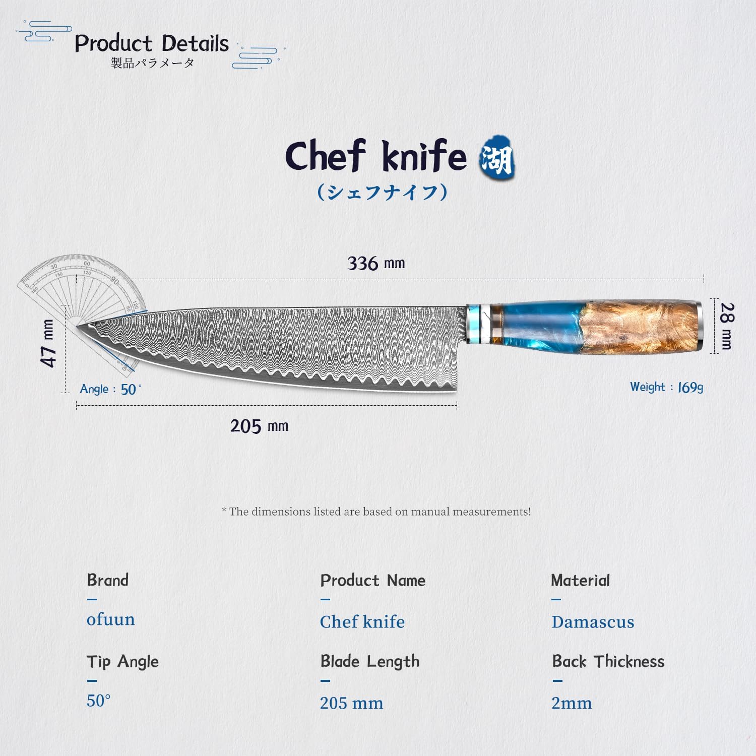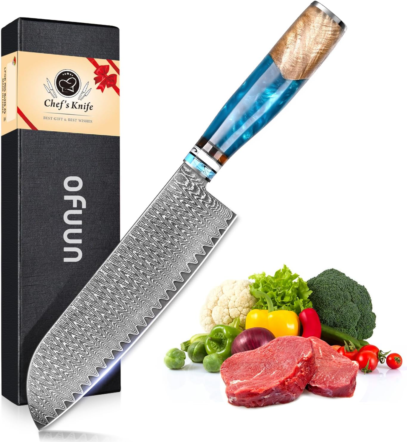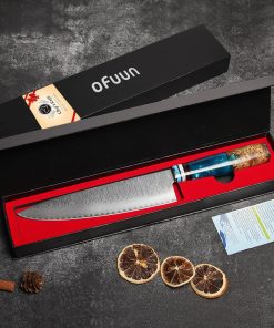 - 【Forgé avec 67 Couches de Tôle d’acier Damas】oFuun couteau de chef est forgé en acier Damas avec un HRC 60-62 (testeur de dureté Rockwell). Un excellent couteau cuisine en acier Damas est plusieurs fois plus tranchant qu’un couteau en acier ordinaire, il empêche la corrosion et l’usure et assure une vie saine dans la cuisine.