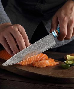 Couteau magnifique, la lame Damas de 20 cm coupe parfaitement et garde son tranchant, l’équilibre est excellent et le manche résine bleu est confortable en main, finition soignée et emballage en boîte cadeau, parfait pour la cuisine quotidienne ou comme cadeau.