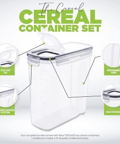 - Ensemble De 6 Conteneurs À Céréales – Notre ensemble complet de conteneurs à céréales comprend 4 conteneurs (4 L/ 135,25 Oz), des autocollants unis et un marqueur blanc pour tableau noir pour faciliter l’étiquetage