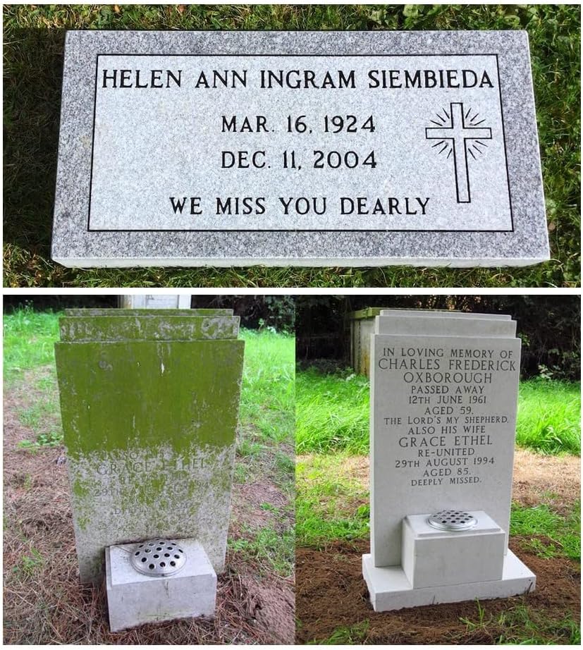 - Le kit comprend également un guide complet étape par étape pour rafraîchir les inscriptions sur la pierre tombale.
