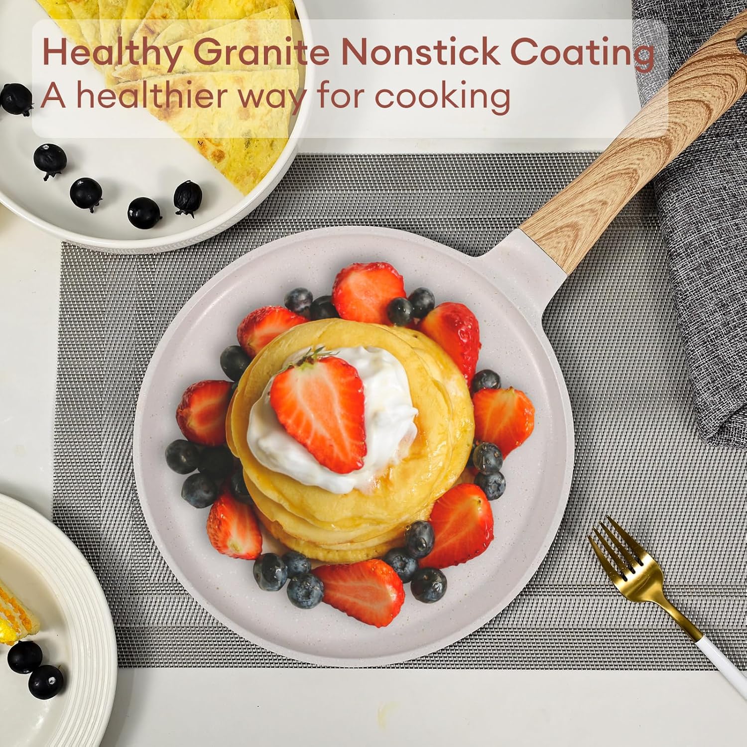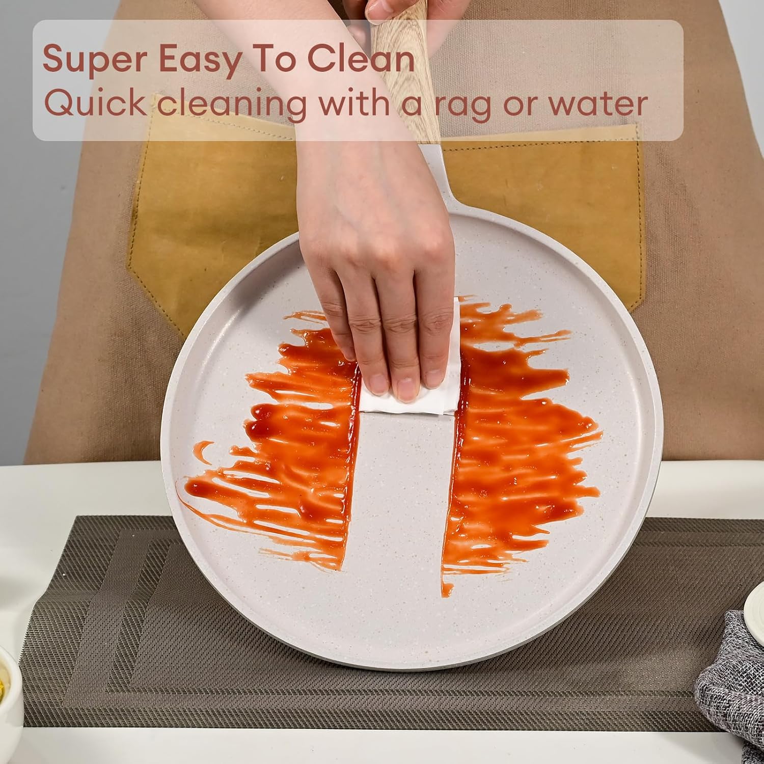 - Polyvalent: Cette poêle est parfaite pour les crêpes, pancakes, crêpes françaises, aussi pour faire frire des œufs, du bacon, des saucisses, et plus encore. Que ce soit pour le petit-déjeuner ou le thé de l’après-midi, c’est une bonne aide, et il nous aide également à réchauffer la pizza dans le four