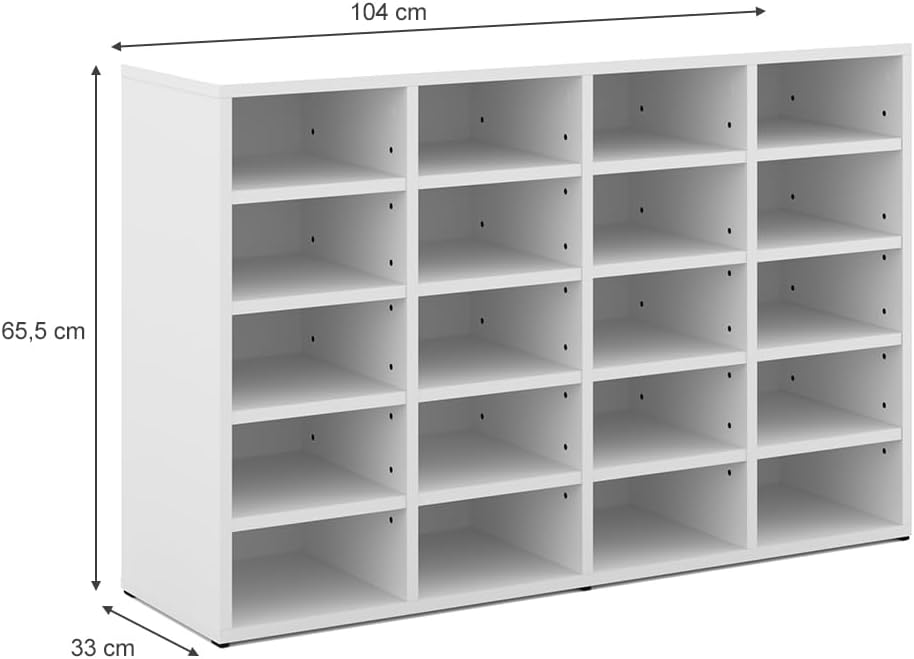 Armoire à chaussures simple et pratique, le blanc est sobre et s’intègre bien, les dimensions 104 x 66 cm offrent un bon rangement pour plusieurs paires sans prendre trop de place, le montage est intuitif et la structure paraît solide pour un usage quotidien, bon rapport qualité-prix.