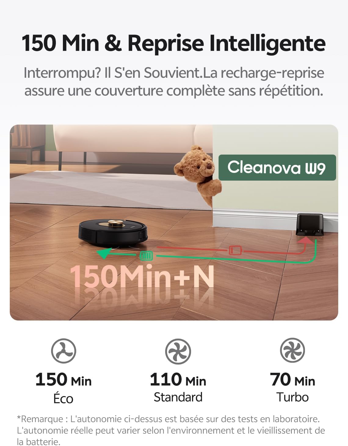 - 【Autonomie exceptionnelle】Le robot aspirateur laveur Cleanova W9 bénéficie d’une autonomie exceptionnelle de 150 minutes par charge, garantissant un nettoyage efficace même sur de grandes surfaces. Surveillez facilement le niveau de batterie en temps réel via l’application. Lorsque la batterie atteint moins de 15 %, le robot retourne automatiquement à sa base pour se recharger, puis reprend le nettoyage exactement là où il s’était arrêté. Parfait pour les grandes habitations, il garantit un nettoyage complet et sans interruption, même dans les espaces les plus étendus.