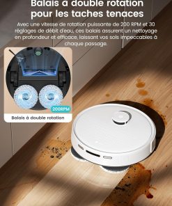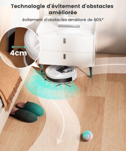 - 【Design compact et agile】Avec son design ultra-plat de seulement 9,8 cm de hauteur, ce aspirateur robot laveur se faufile sans effort dans les espaces les plus exigus, même sous les meubles bas ou entre les pieds de lit. Son agility lui permet de contourner intelligemment les obstacles et de nettoyer en profondeur les recoins inaccessibles aux autres appareils.
