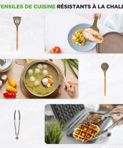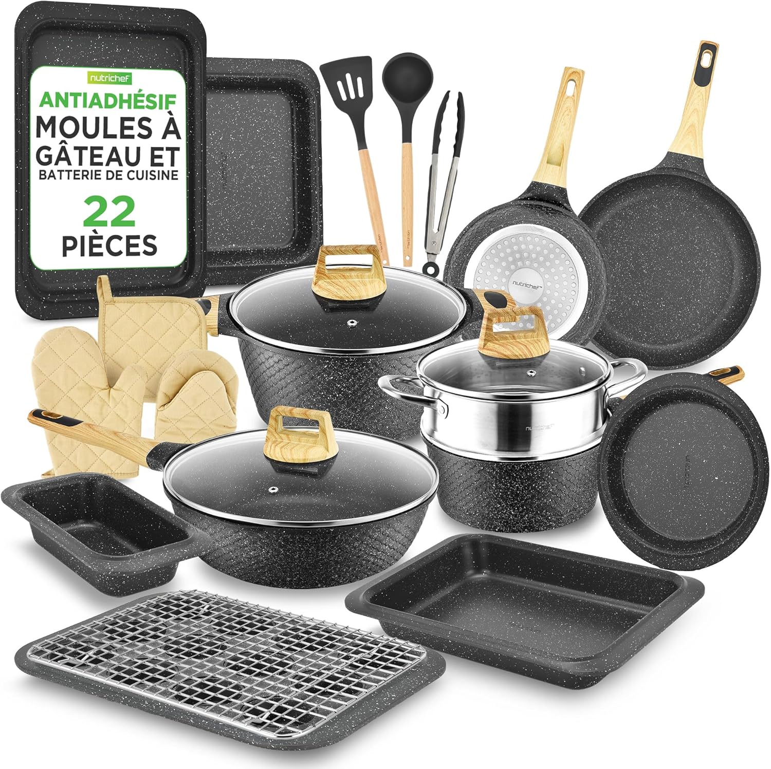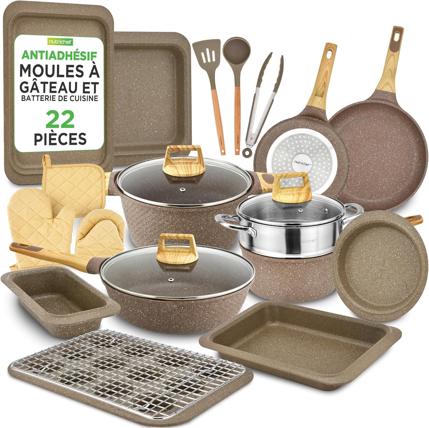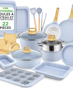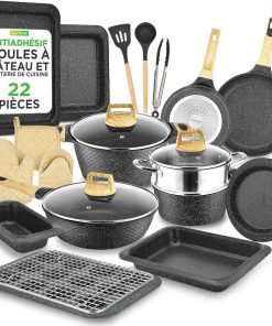 Très satisfait de cette batterie NutriChef 22 pièces : le revêtement antiadhésif tient vraiment bien, compatible induction, les poignées sont confortables et les ustensiles résistent bien à la chaleur. Le marbre marron est élégant et tout se nettoie facilement. Bon rapport qualité-prix, je la recommande pour un usage quotidien.