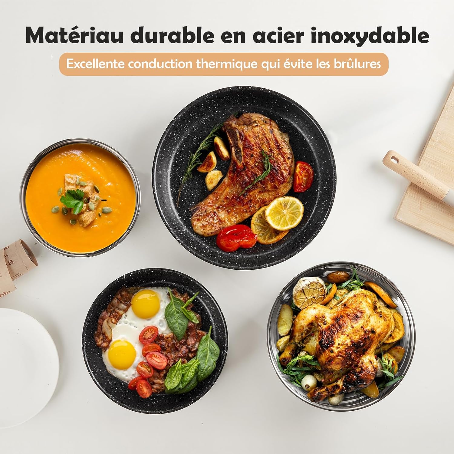 - Casseroles en acier inoxydable pratiques et durables : Fabriqué en acier inoxydable résistant à la chaleur et à la corrosion, avec une longue durée de vie et lavable au lave-vaisselle. Ce set convient à tous les types de feux, y compris les plaques à induction, et est également résistant au four jusqu’à 240 ℃