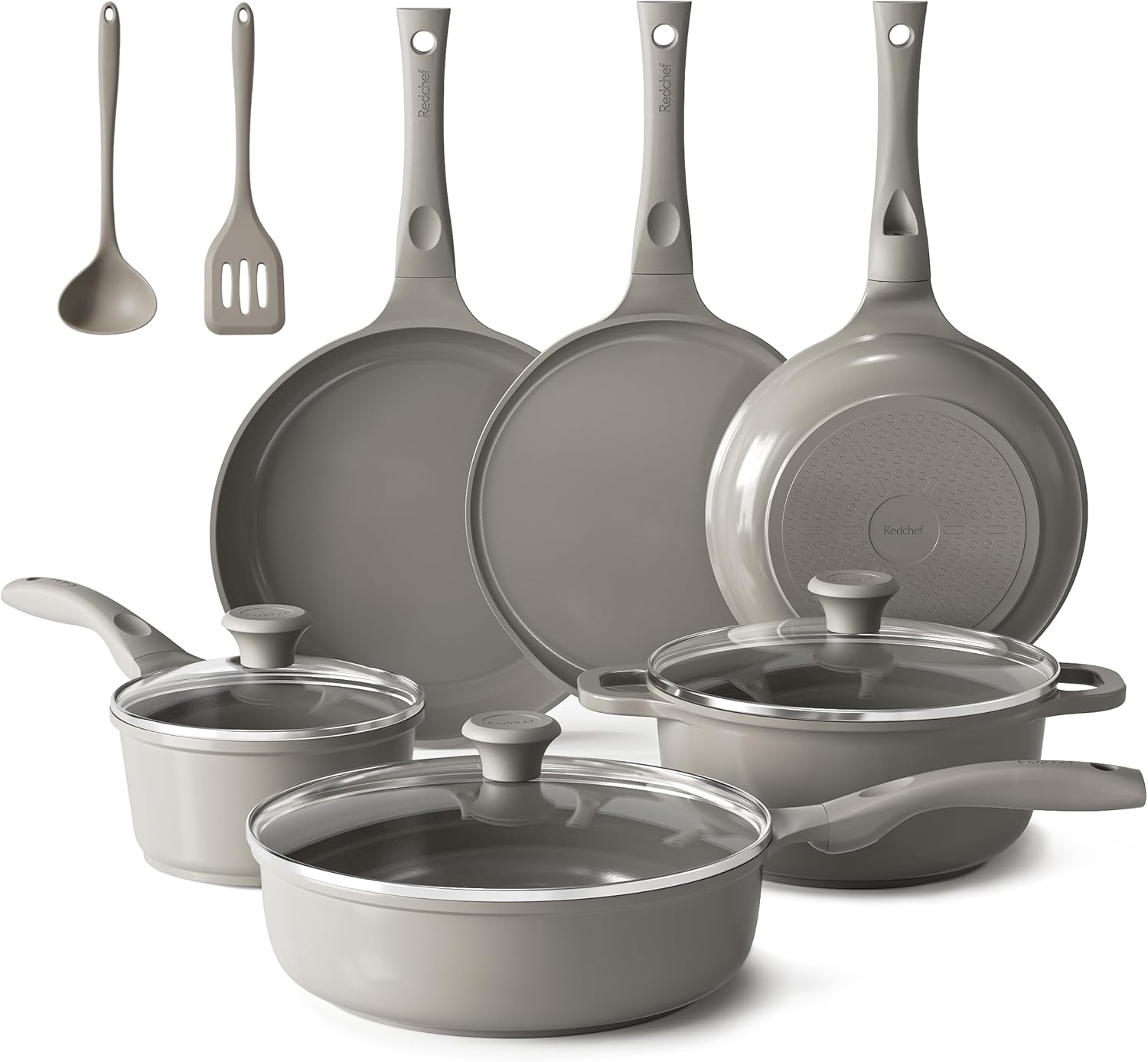 Ensemble de 11 casseroles en céramique très pratique, compatible avec l’induction et tous types de feux, sans PTFE ni PFAS; les couvercles en verre permettent de surveiller la cuisson, la finition grise est sobre et elles passent bien au lave-vaisselle, bon rapport qualité-prix.