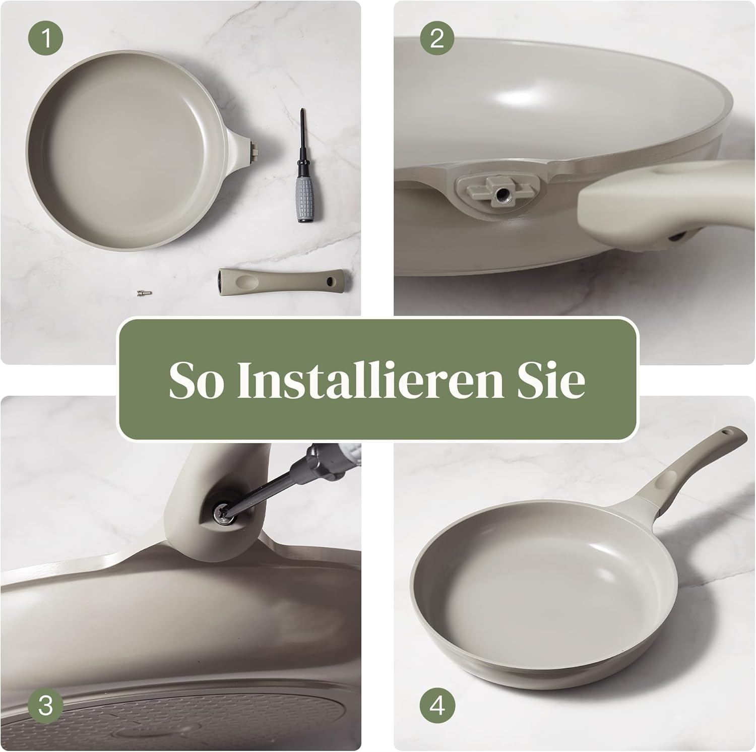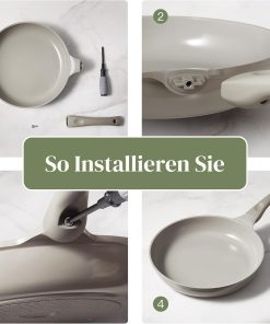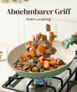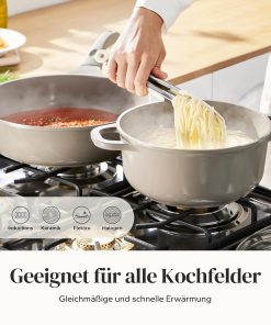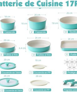 - Dimensions : 1 poêle 24 cm, 1 poêle 28 cm, 1 poêle à crêpe 26 cm, 1 sauteuse avec couvercle 28 cm, 1 casserole avec couvercle 16 cm/2 l, 1 Faitout avec couvercle 24 cm/4 l. Une large gamme de tailles pour répondre à tous vos besoins de friture, de cuisson, de braiser et de remuer. Chaque ustensile de cuisine dispose d’un revêtement en céramique de qualité alimentaire sans produits chimiques tels que PFAS et PTFE.