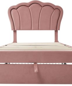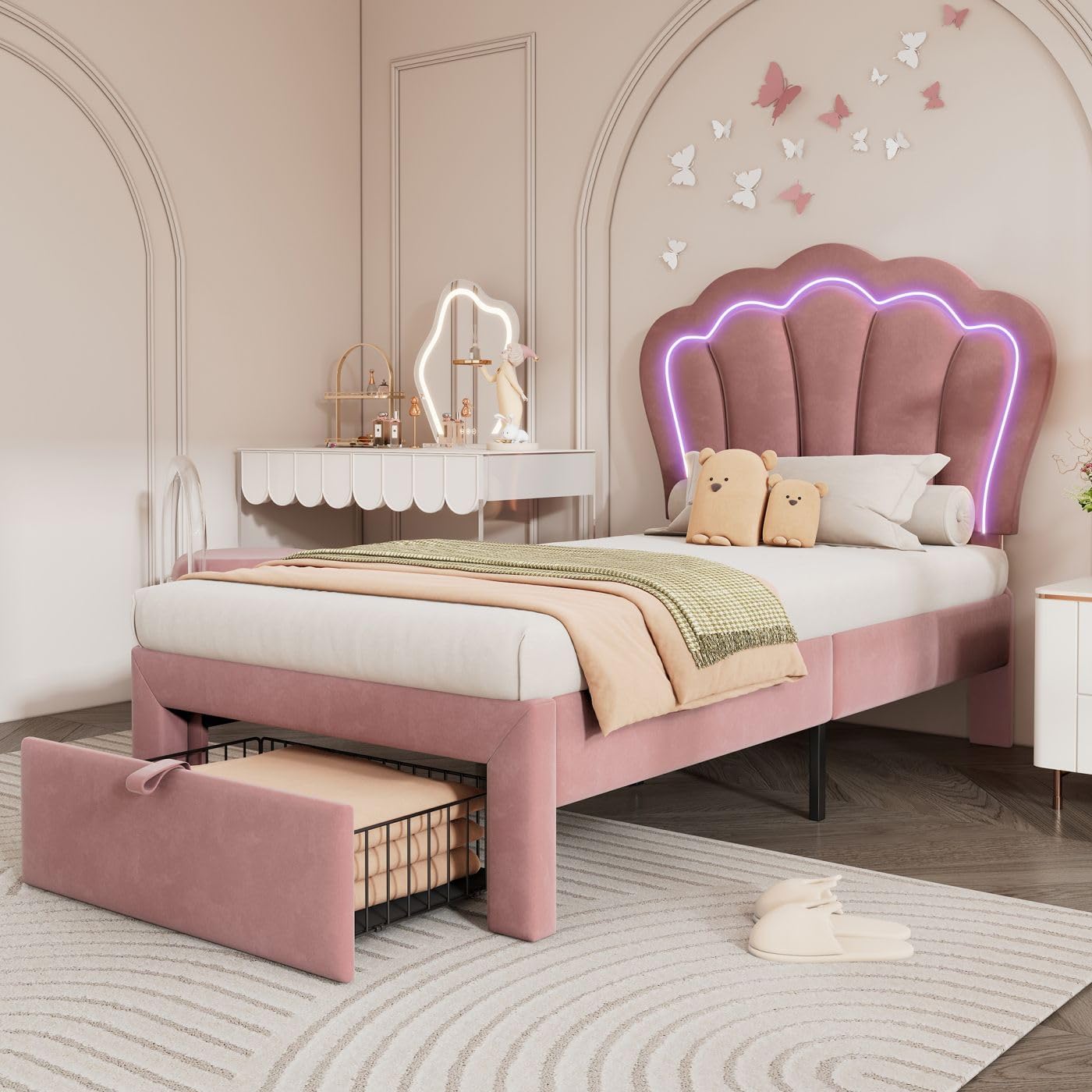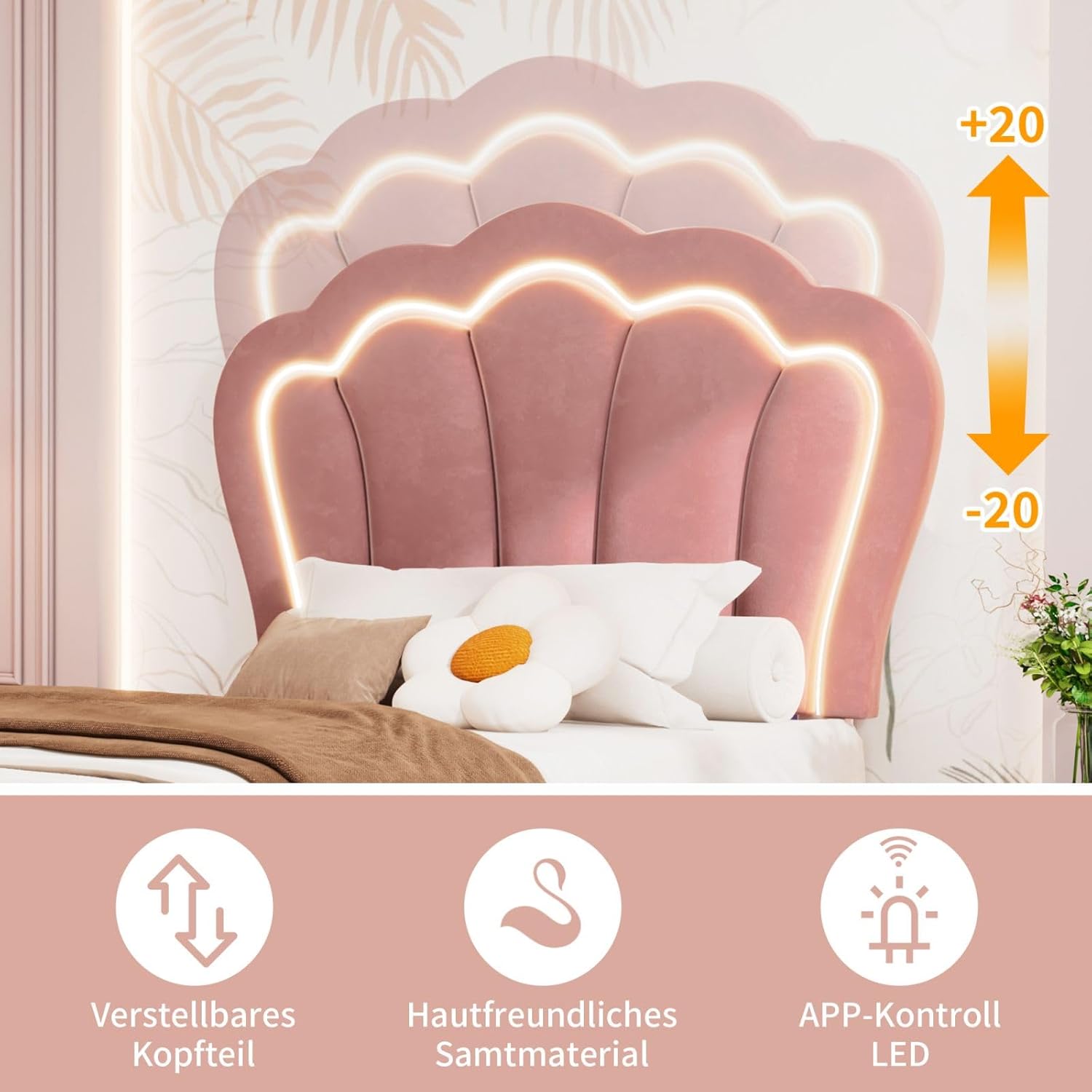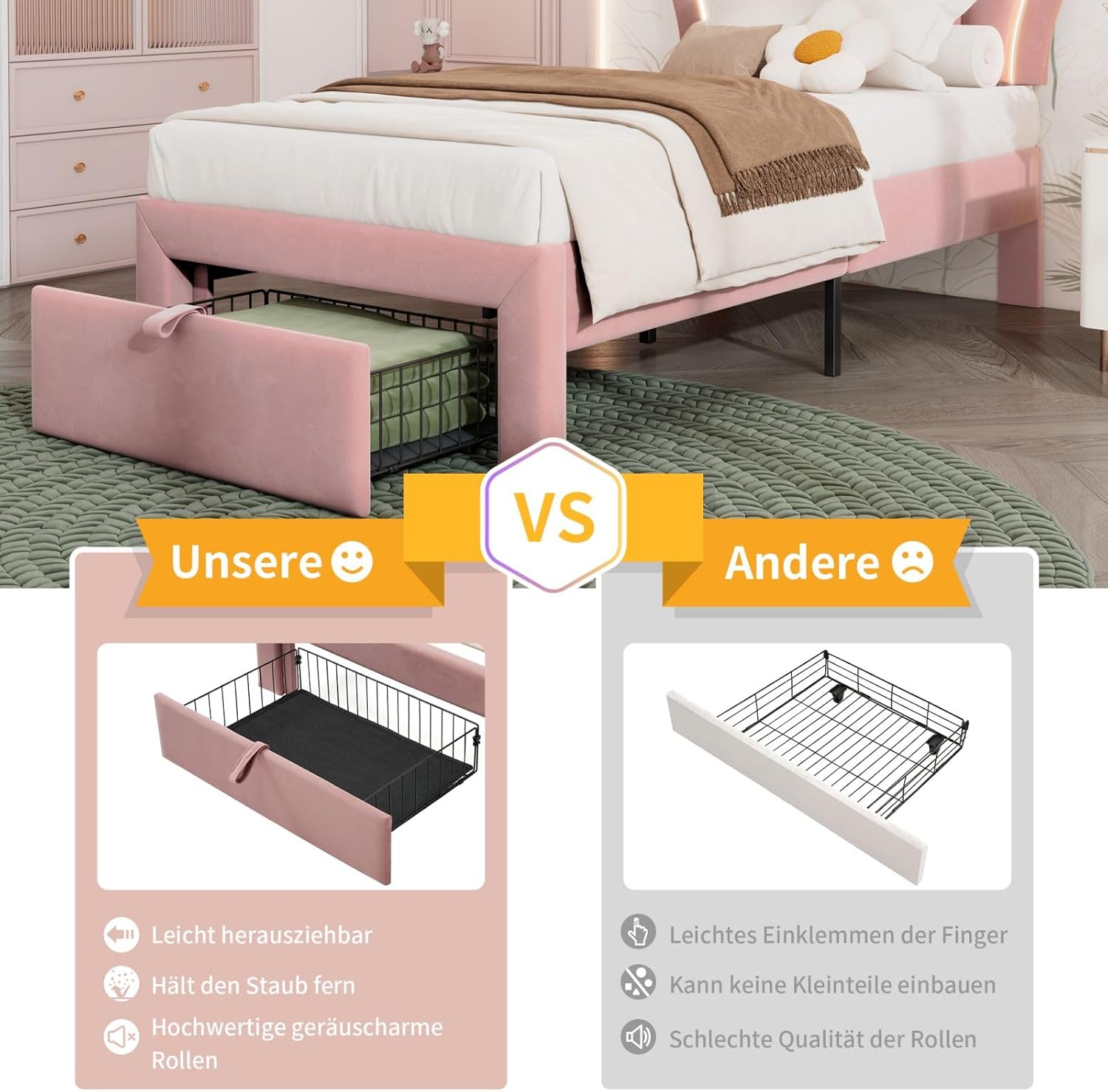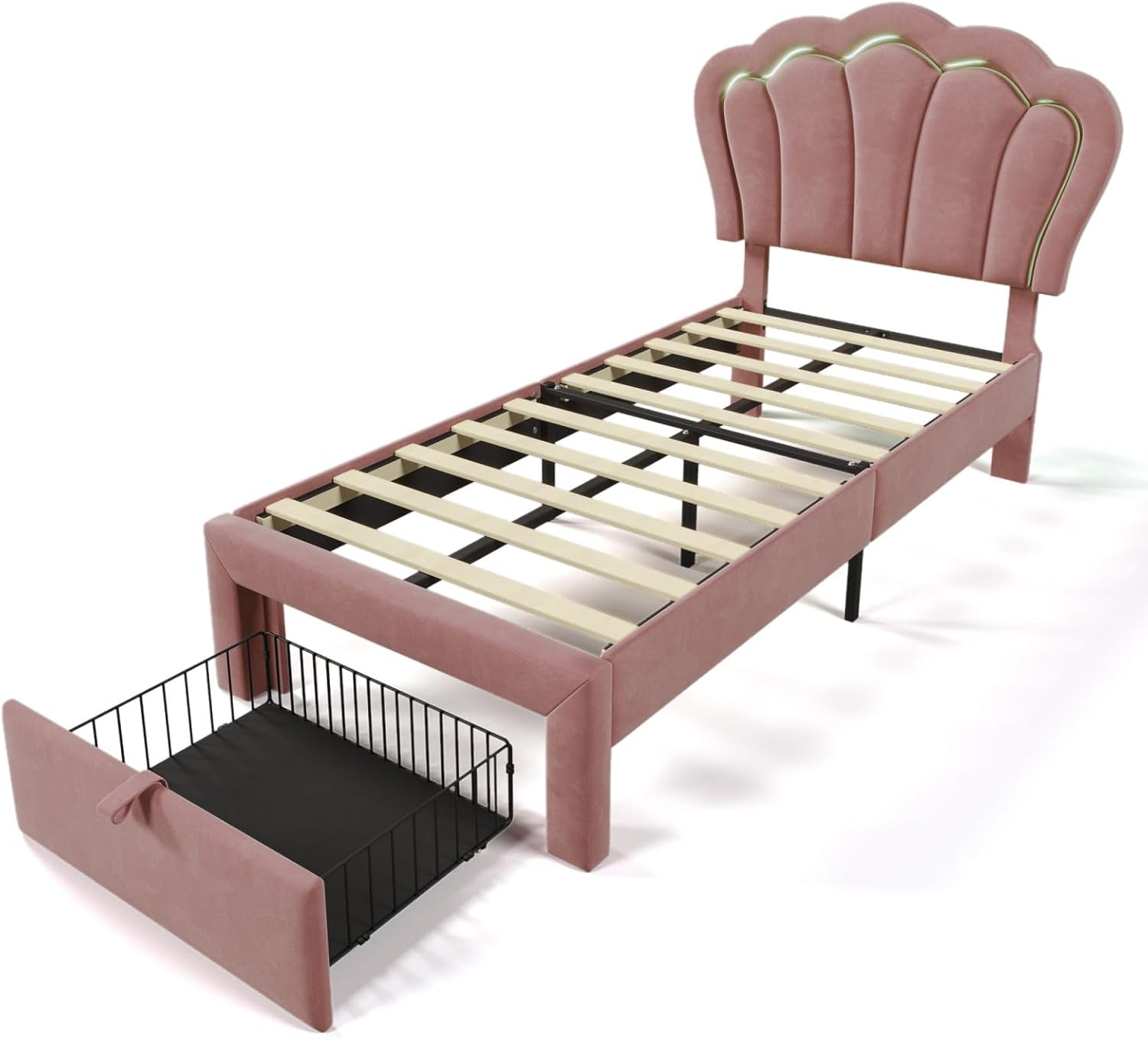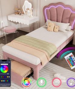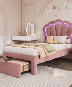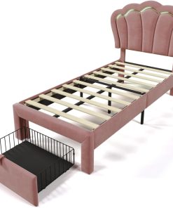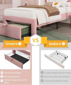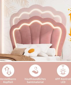 Sweiko Lit Enfant capitonné 90 x 190 cm, lit Simple LED avec tiroirs, Cadre de lit Junior avec sommier à Lattes et tête de lit réglable, Velours Lits de Rangement