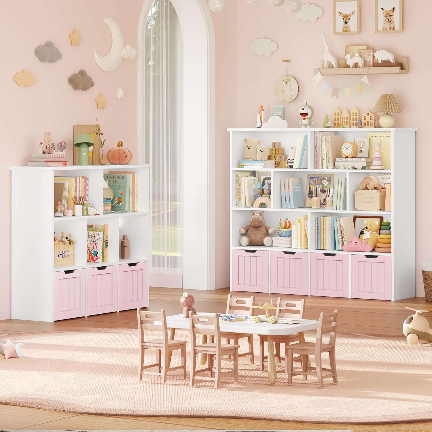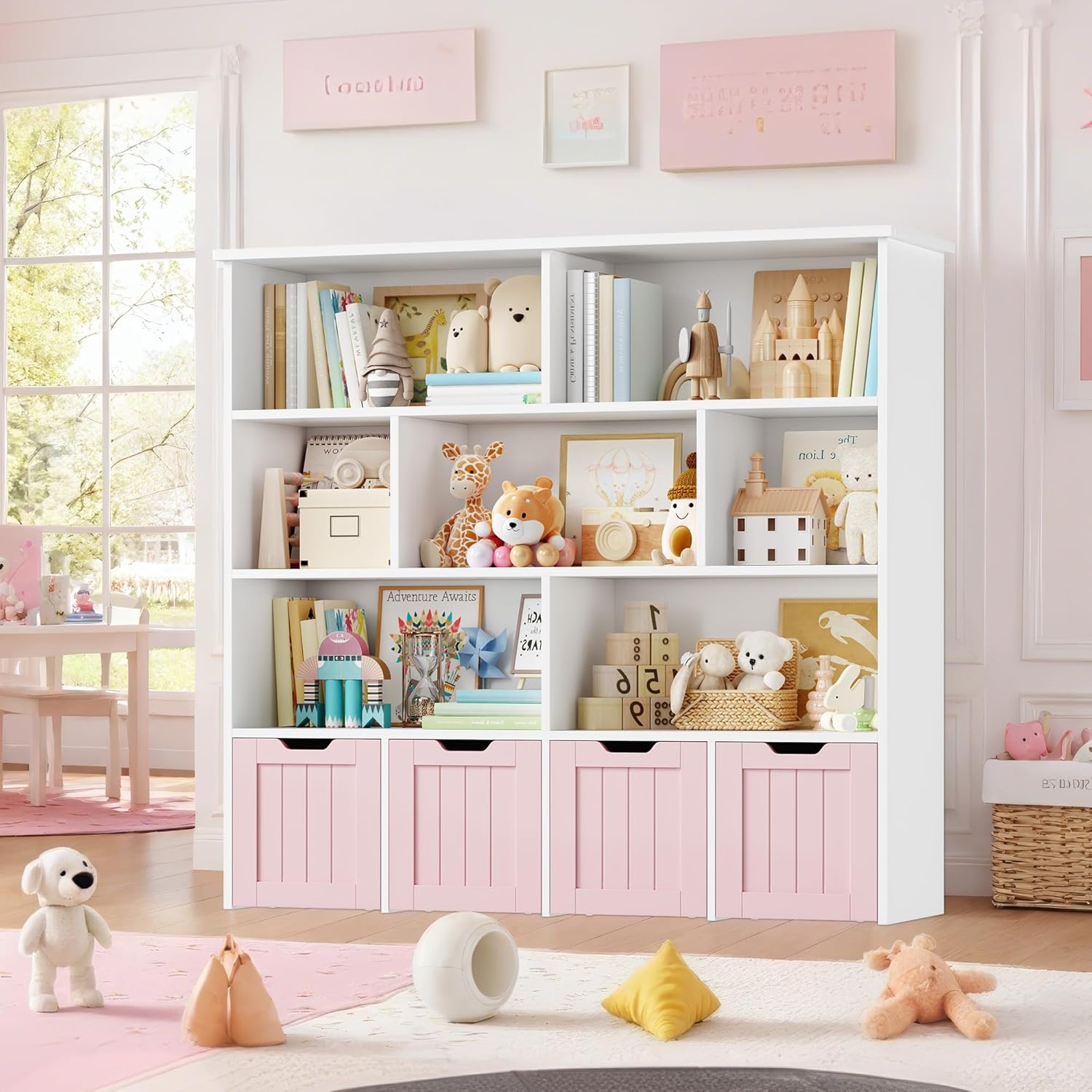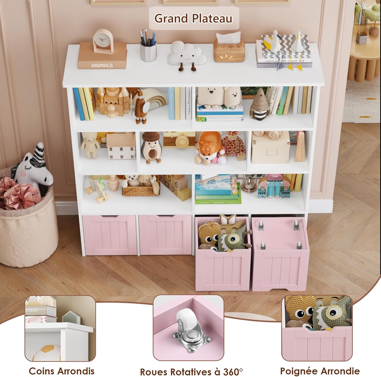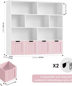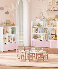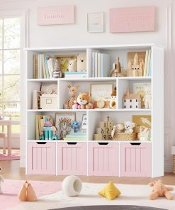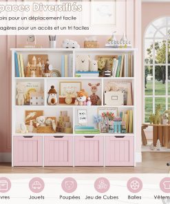 Meuble pratique et bien pensé avec huit étagères et quatre tiroirs roulants qui facilitent le rangement des jouets et des livres, la taille convient bien à une chambre ou une salle de jeu, la finition rose est jolie et l’assemblage est simple, les matériaux semblent suffisamment solides pour un usage quotidien.