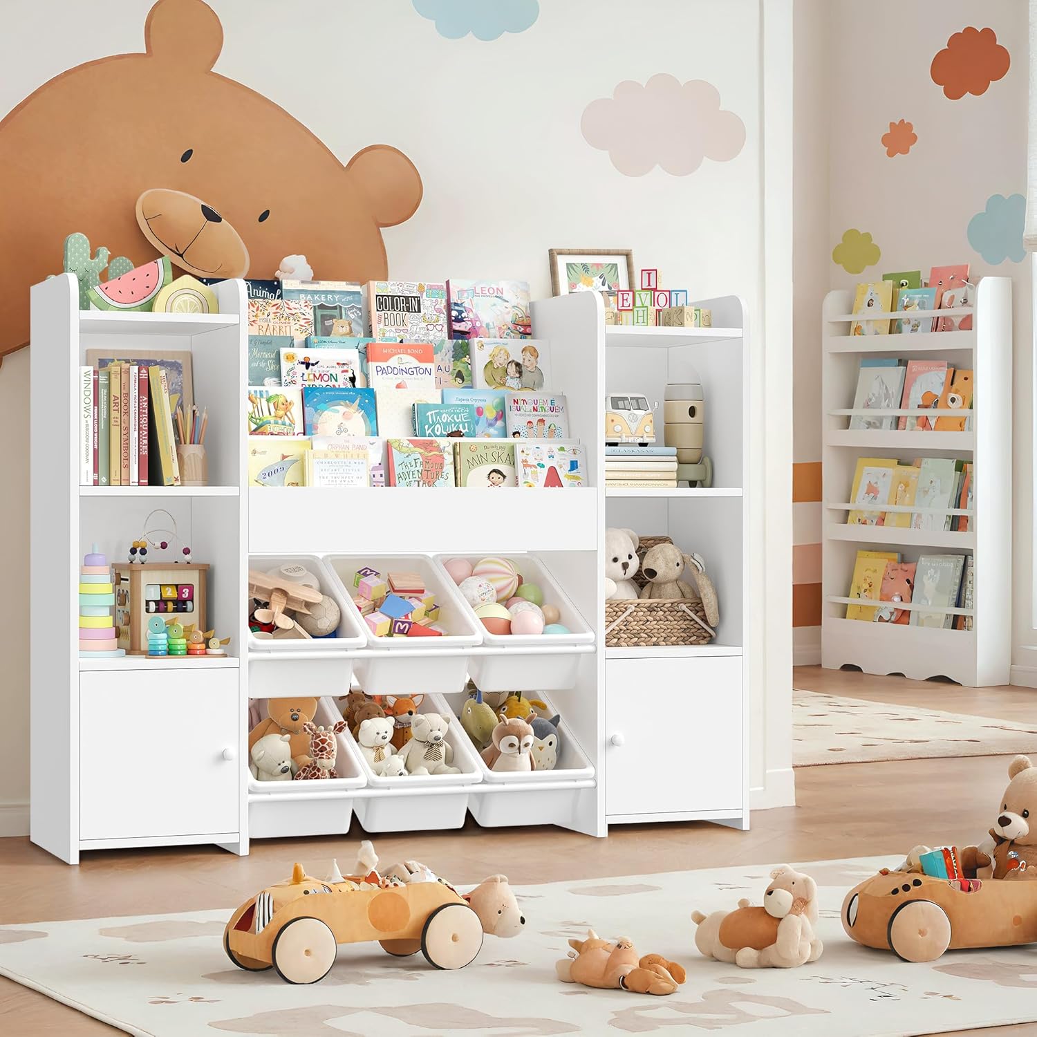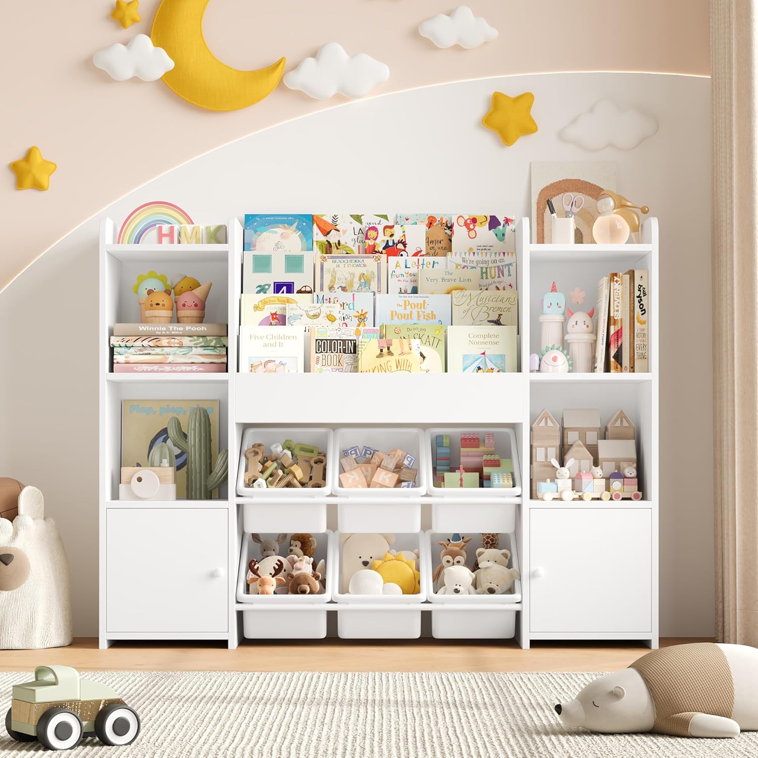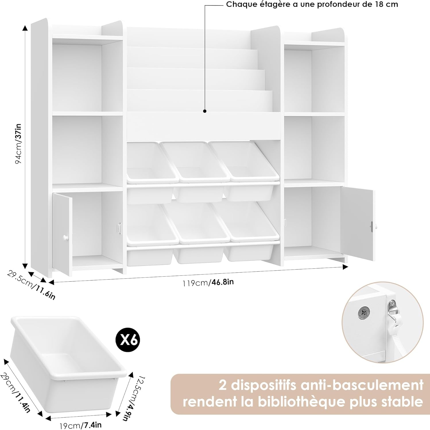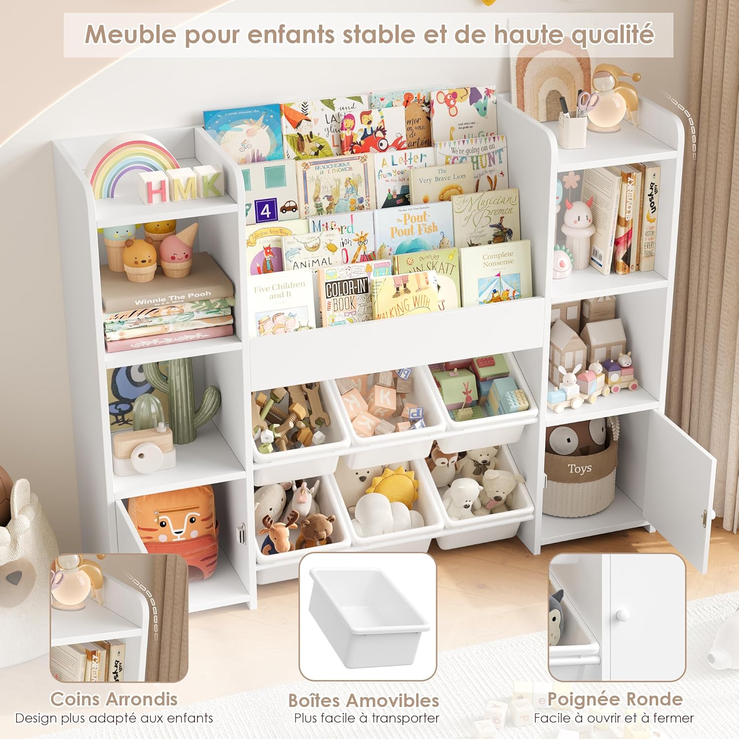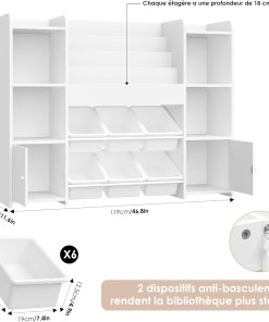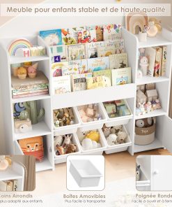 - [Matériau de haute qualité] : rangement jouet enfant salle de jeu est faite de bois et de plastique de haute qualité, stables et durables et parfaits pour que les enfants puissent ranger divers jouets. Chaque étagère à livres peut supporter 5 kg (5 à 10 livres). Le plateau de la bibliothèques enfant peut contenir 20 kg, chaque compartiment 10 kg, chaque boîte 5 kg. Le design des coins arrondis du meuble rangement enfant pour éviter les rayures accidentelles. De plus, notre meuble rangement jouet est équipé de dispositifs de protection anti-basculement pour réduire les risques potentiels