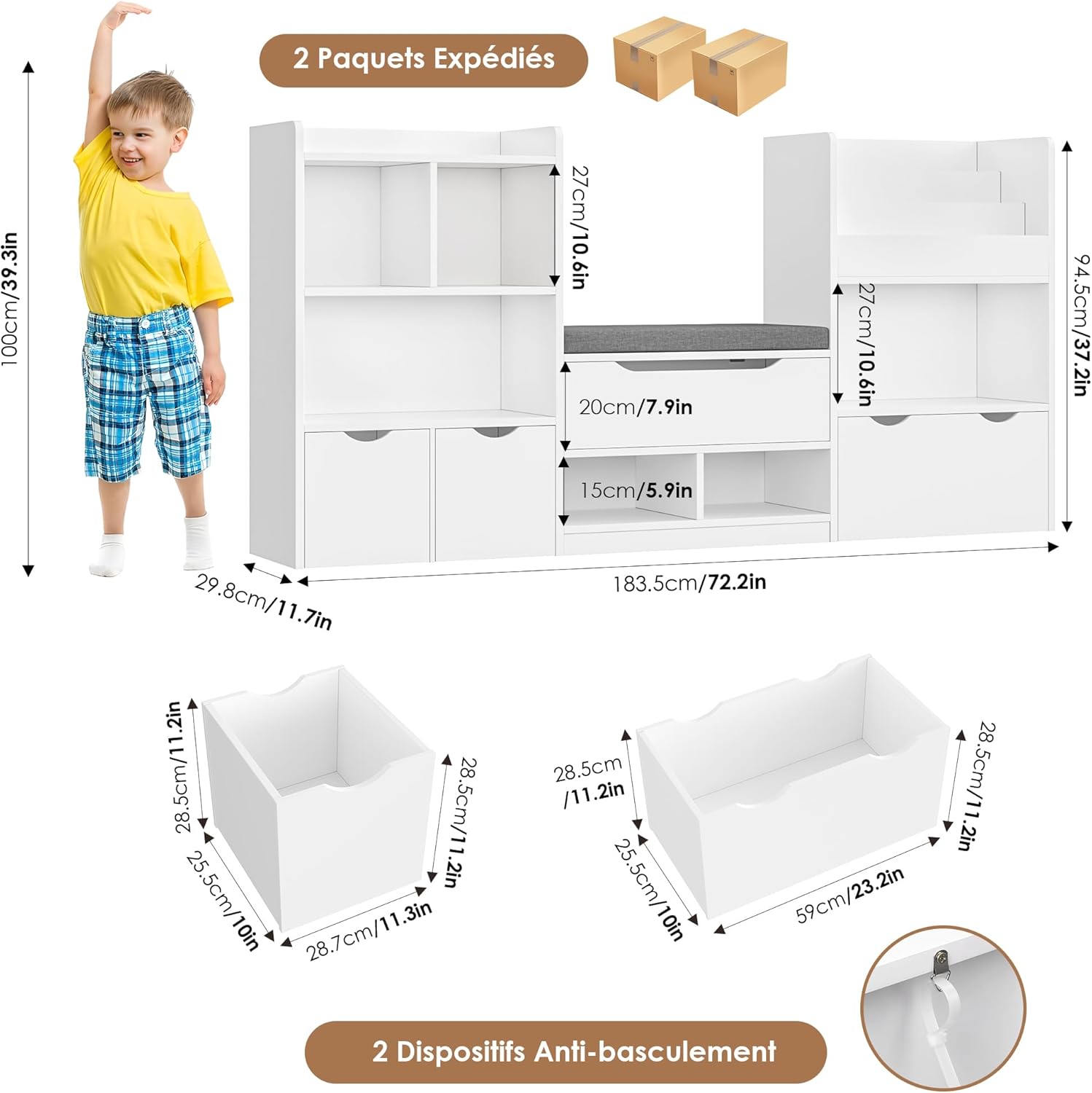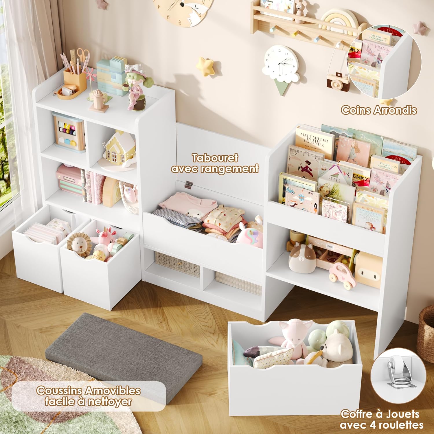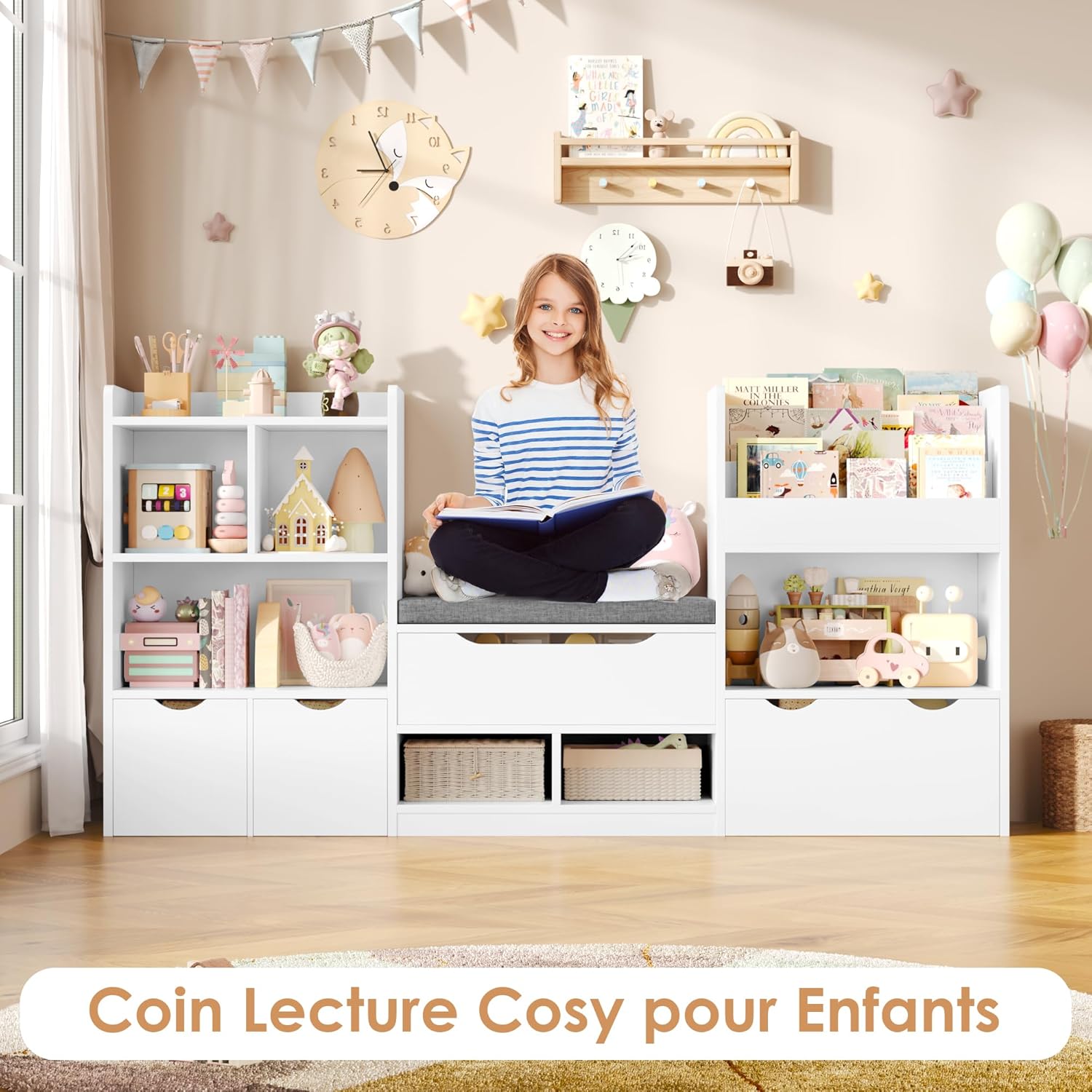 - [4 en 1 Meuble de rangement ] : La conception en couches de la bibliotheque enfant met bien en valeur les couvertures des livres, aidant les enfants à reconnaître les couleurs et les motifs. 11 grands espaces de rangement permettent aux enfants de ranger leurs jouets, poupées, livres ou vêtements préférés. Les deux tailles de boîtes de rangement à 306° permettent aux enfants de s’amuser tout en rangeant la pièce. Le banc avec rangement pour cacher facilement oreillers, couvertures, etc