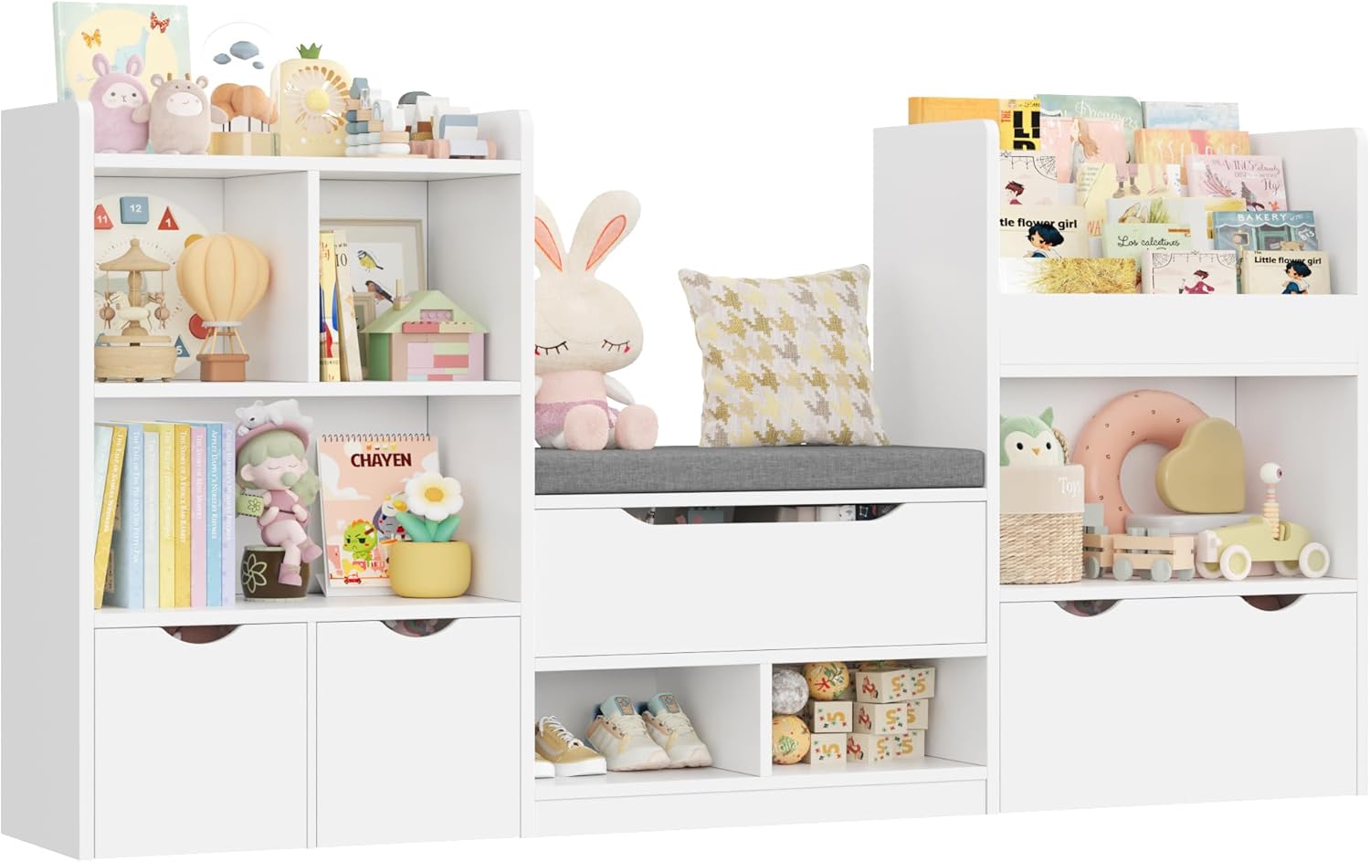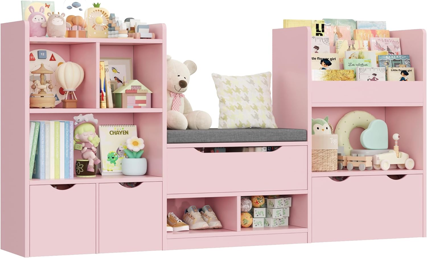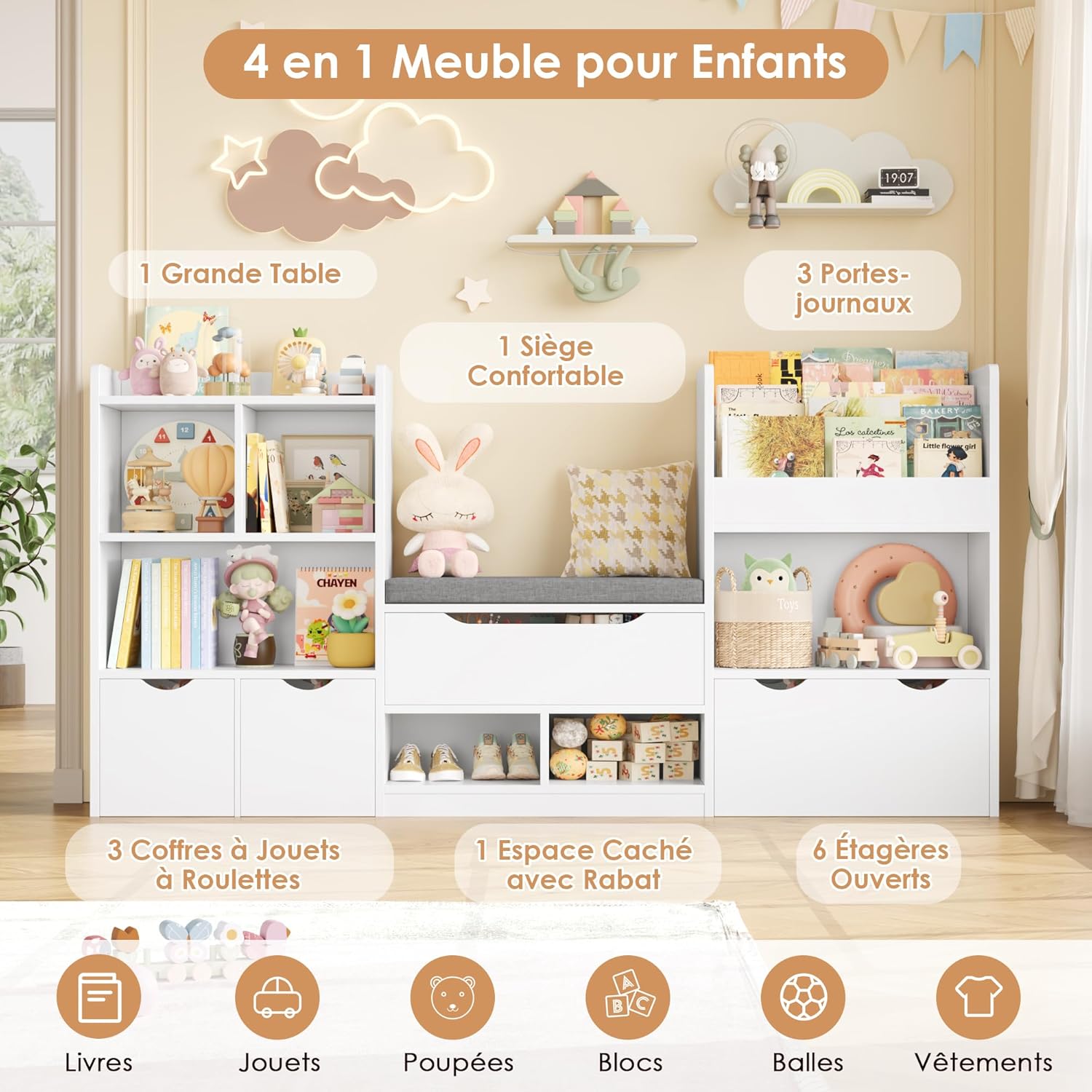 - [4 en 1 Meuble de rangement ] : La conception en couches de la bibliotheque enfant met bien en valeur les couvertures des livres, aidant les enfants à reconnaître les couleurs et les motifs. 11 grands espaces de rangement permettent aux enfants de ranger leurs jouets, poupées, livres ou vêtements préférés. Les deux tailles de boîtes de rangement à 306° permettent aux enfants de s’amuser tout en rangeant la pièce. Le banc avec rangement pour cacher facilement oreillers, couvertures, etc