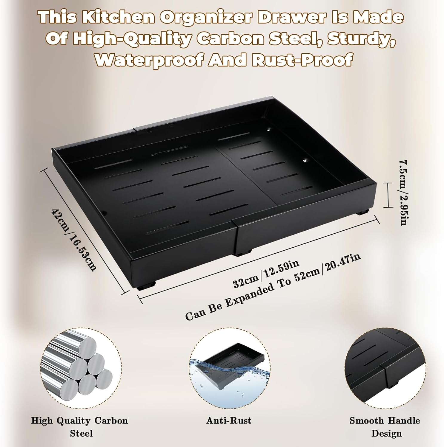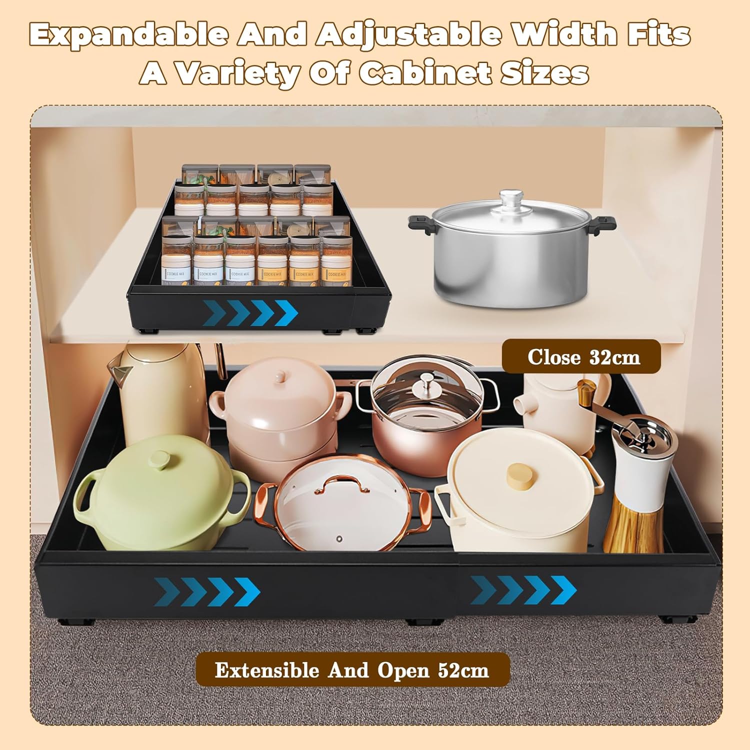- 【Design Extensible et Flexible】Notre plateau coulissant est réglable en largeur, Taille initiale d'environ 32 cm, longueur maximale d'extension jusqu'à 52 cm, hauteur de 7,5 cm. Le tiroir peut être ajusté selon la taille souhaitée, offrant ainsi plus de confort et de commodité. Capacité de charge maximale d'environ 30 kg. Le design télescopique optimise l'espace dans le placard et s'adapte facilement à vos besoins quotidiens