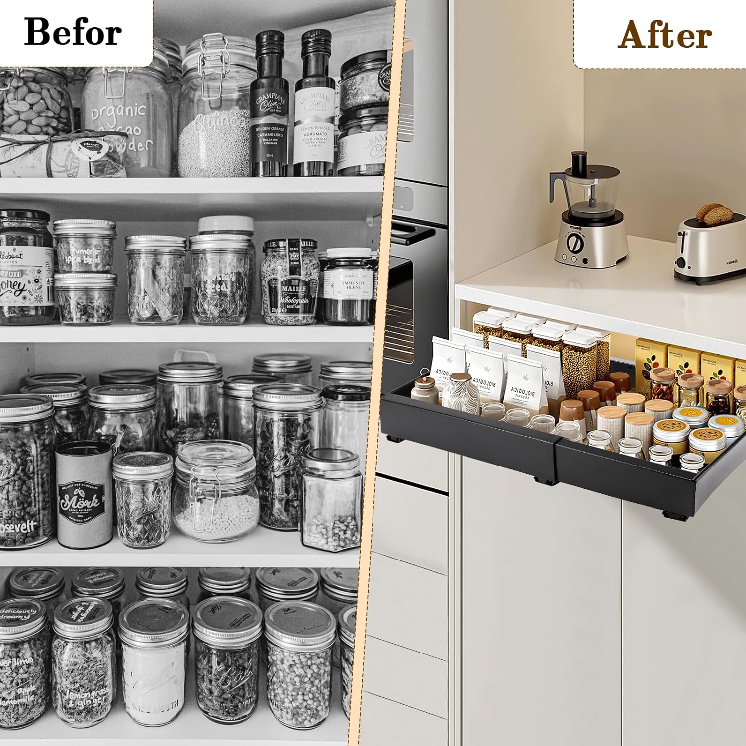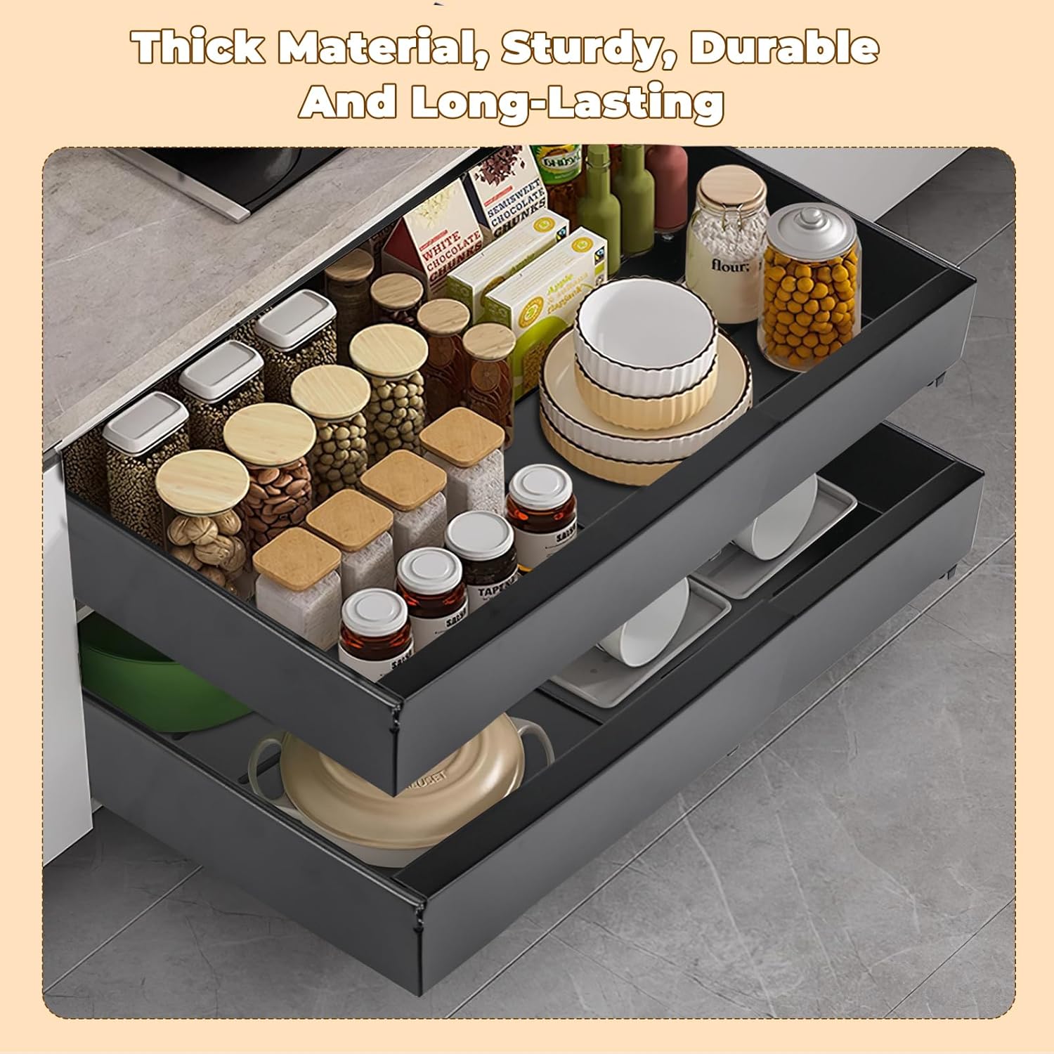 - 【Fonctionnement Fluide et Silencieux】Notre organisateur de garde-manger est équipé de rails amortis, testés pour plus de 4 000 cycles d’ouverture et de fermeture. Il glisse en douceur sans bruits gênants. Vous profiterez d'une ouverture rapide et sans accroc, facilitant l'accès aux articles difficiles à atteindre à l'arrière des placards