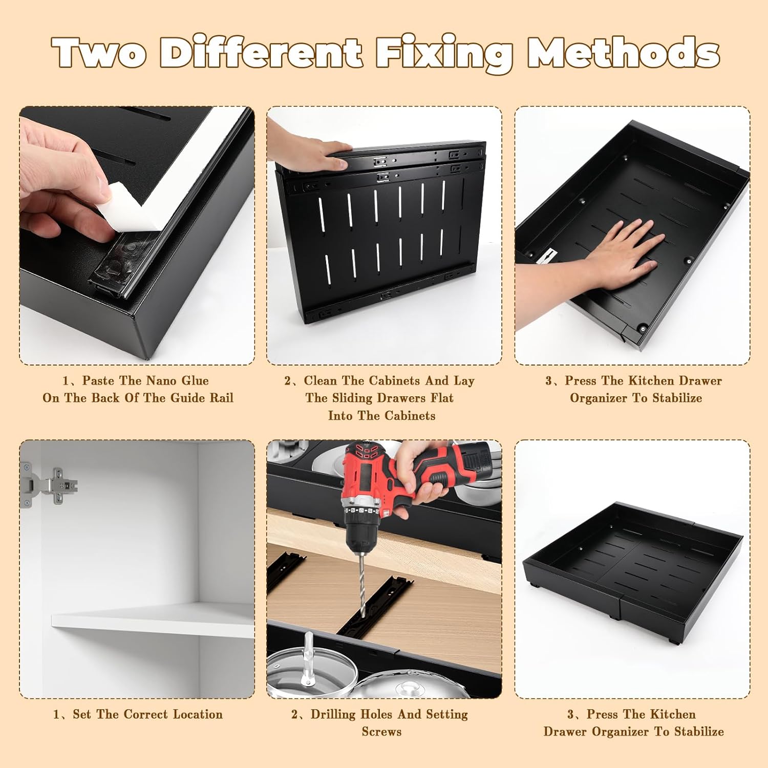 - 【Installation Facile】Grâce à un processus d'installation simplifié de 10 secondes, l'organisateur de tiroir et de cuisine se fixe sans effort. Une notice claire est fournie, et vous pouvez le monter avec les vis incluses ou avec l'adhésif nano, sans besoin d'outils. Il suffit de retirer le film nano et de coller l'organisateur sur la surface.